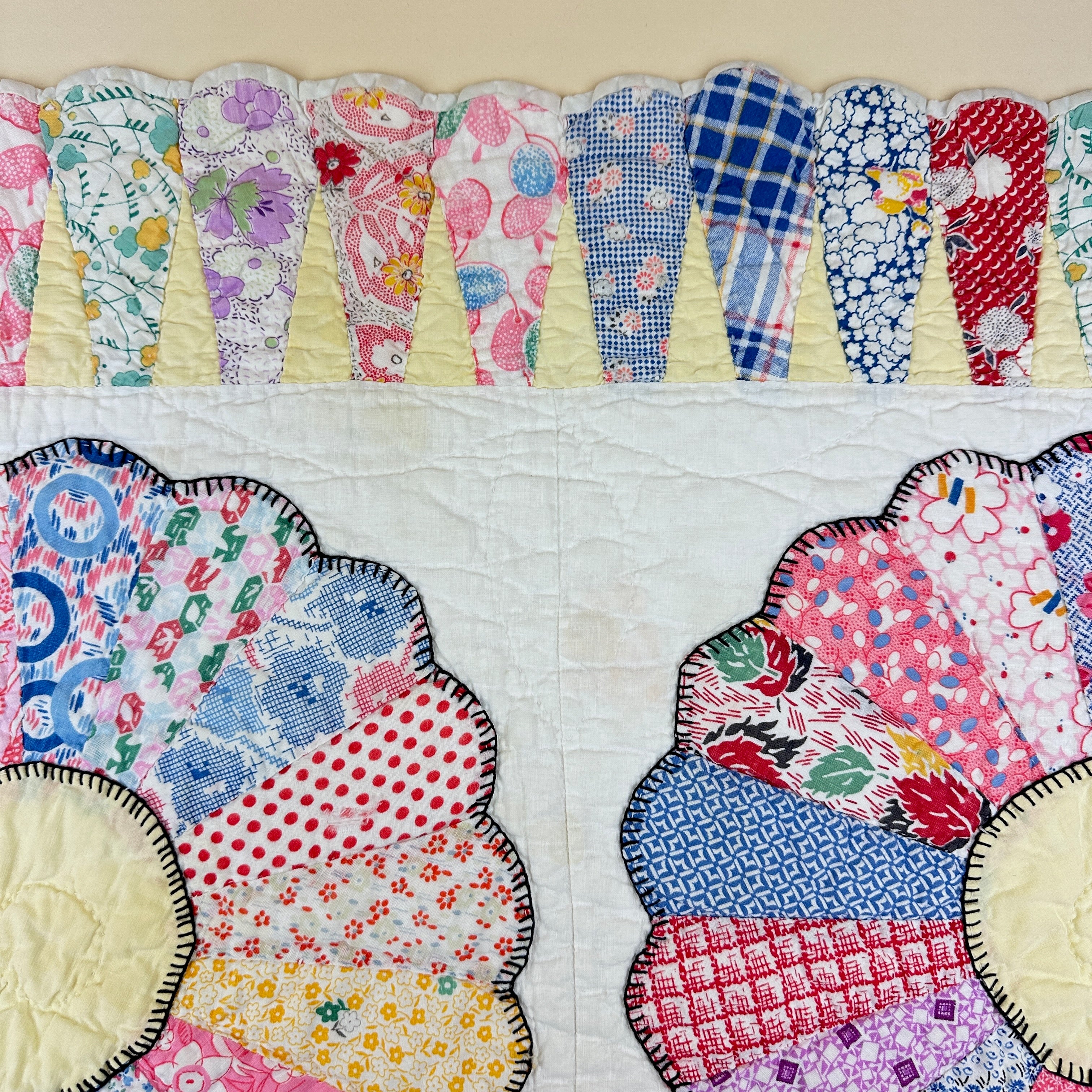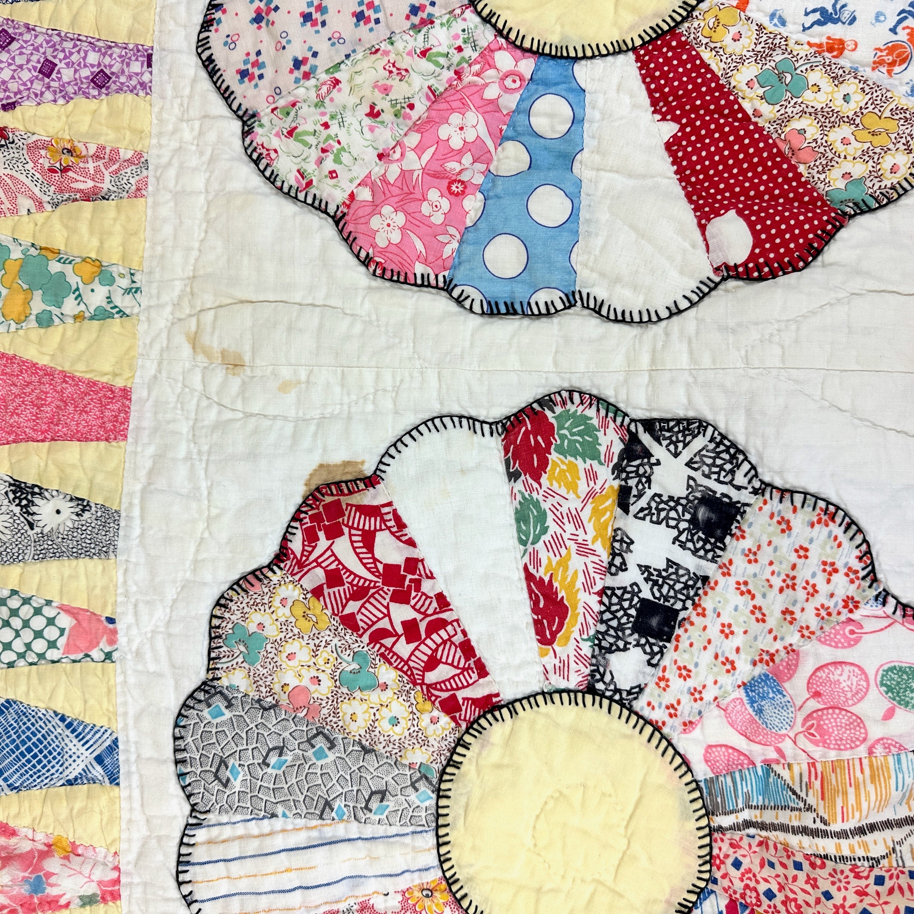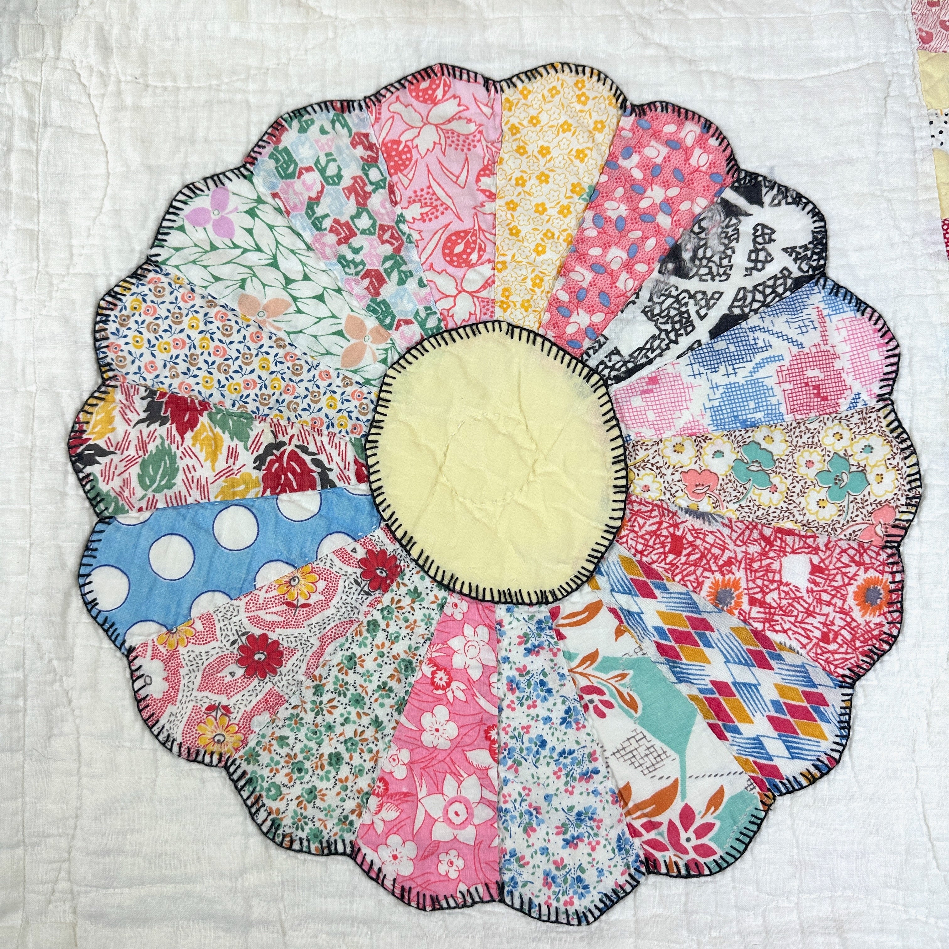 From the 1930s-40s, this vintage quilt features the Dresden Plate pattern with a lovely scalloped, ice cream cone border. It is made of flour sack cloth and other cottons. There are lots of florals and geometric prints, and also few great novelty prints. A couple of my favs are one with a pig jumping through a hoop, and another with a cop chasing a clown. It is a lightweight quilt with an inner layer of cotton batting. It was largely hand sewn and all hand quilted, but the seams between the blocks were machine sewn. It has about a dozen patches that are shattering with most being along the ice cream cone border, but no open seams or through holes. It also has a few small spots.