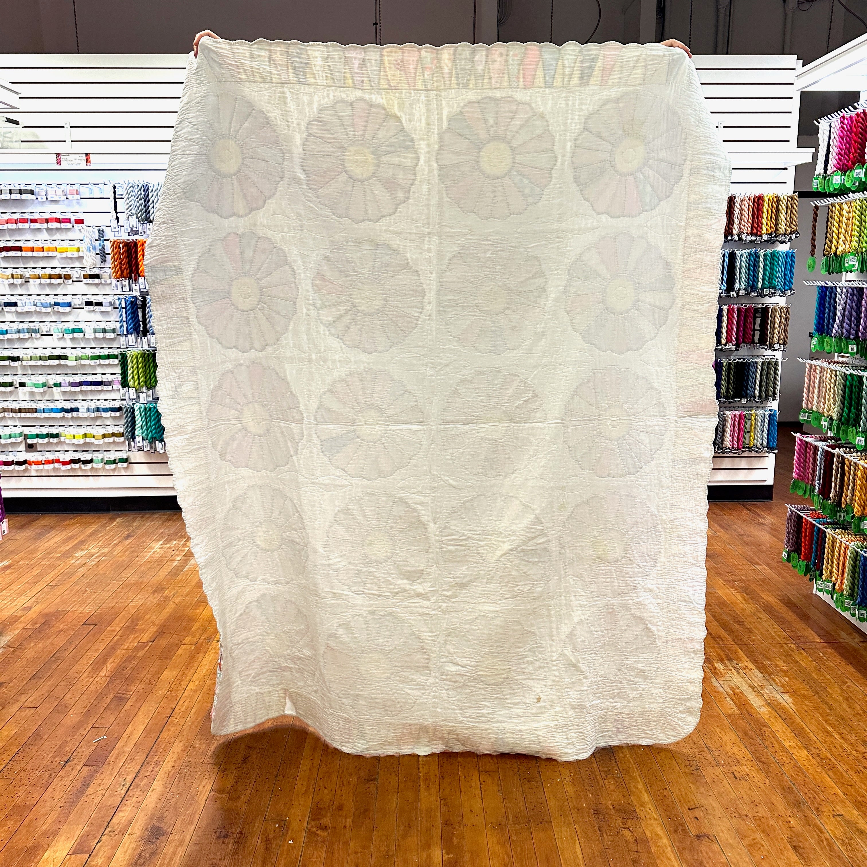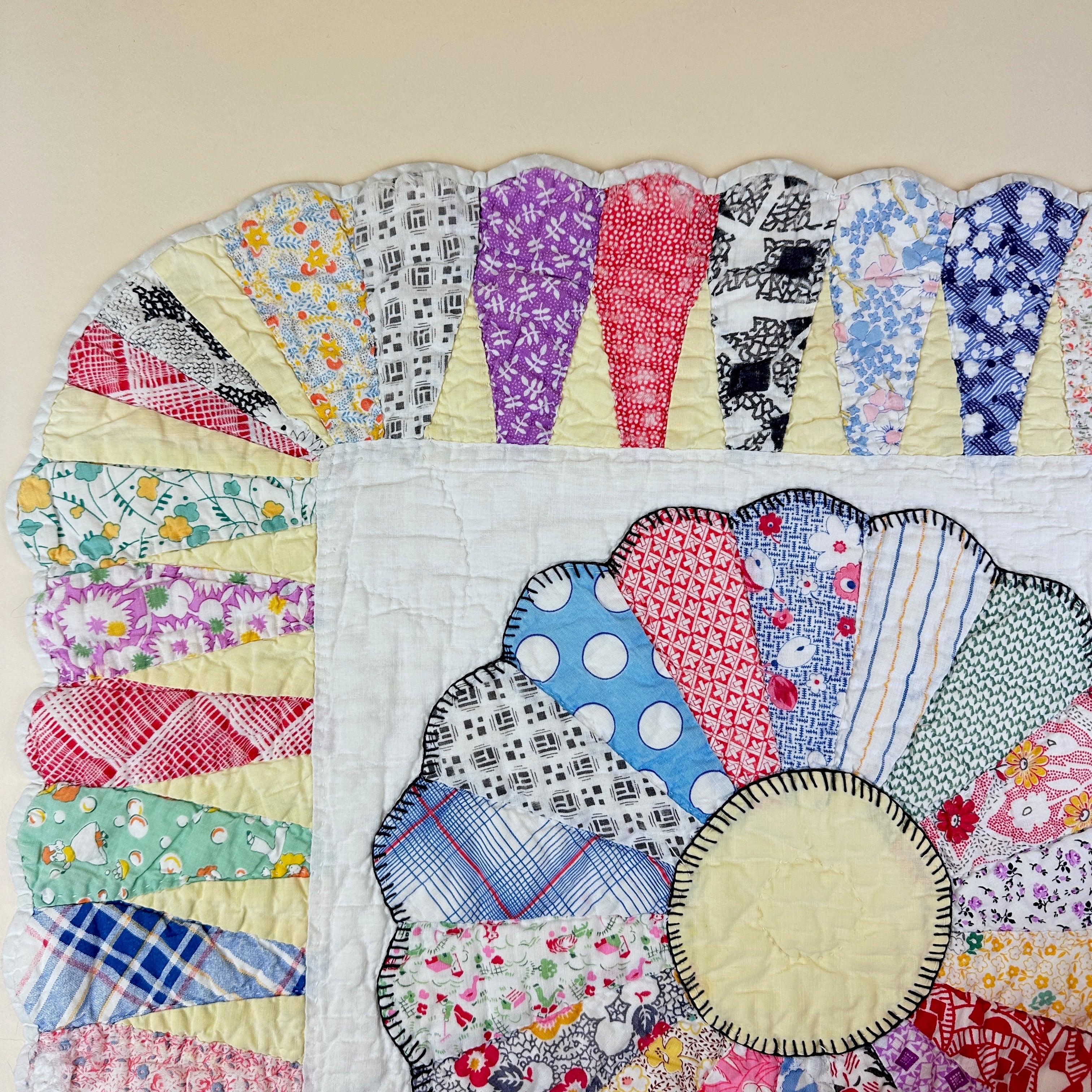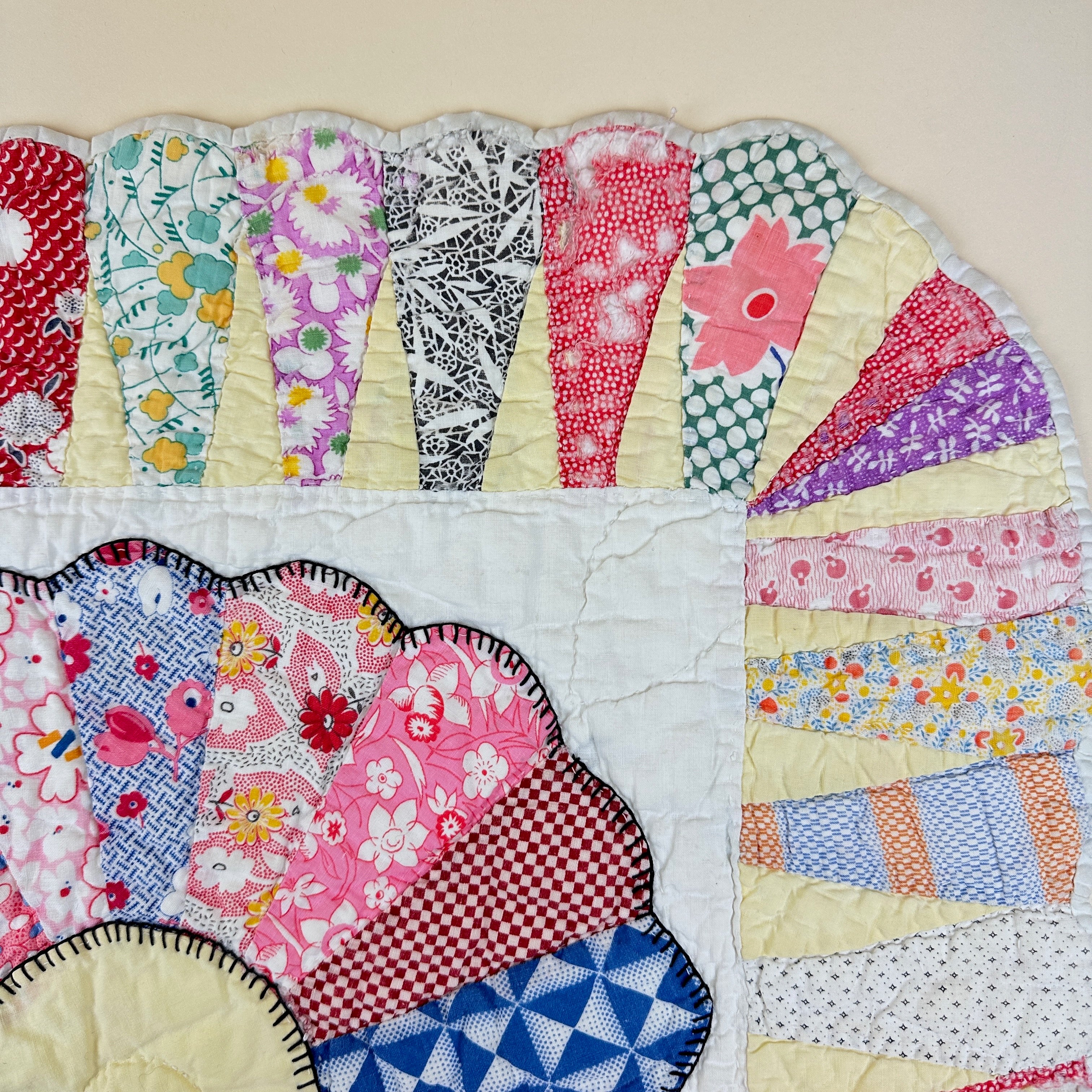 From the 1930s-40s, this vintage quilt features the Dresden Plate pattern with a lovely scalloped, ice cream cone border. It is made of flour sack cloth and other cottons. There are lots of florals and geometric prints, and also few great novelty prints. A couple of my favs are one with a pig jumping through a hoop, and another with a cop chasing a clown. It is a lightweight quilt with an inner layer of cotton batting. It was largely hand sewn and all hand quilted, but the seams between the blocks were machine sewn. It has about a dozen patches that are shattering with most being along the ice cream cone border, but no open seams or through holes. It also has a few small spots.