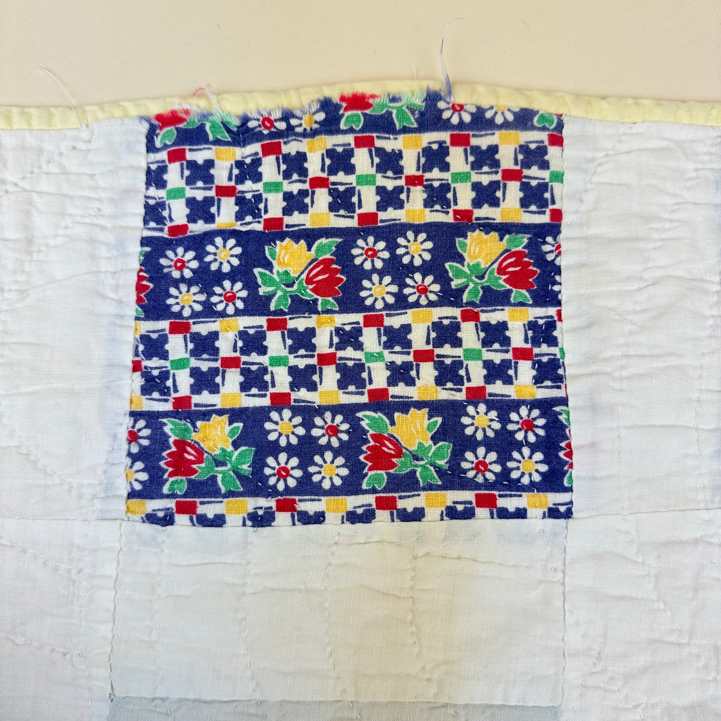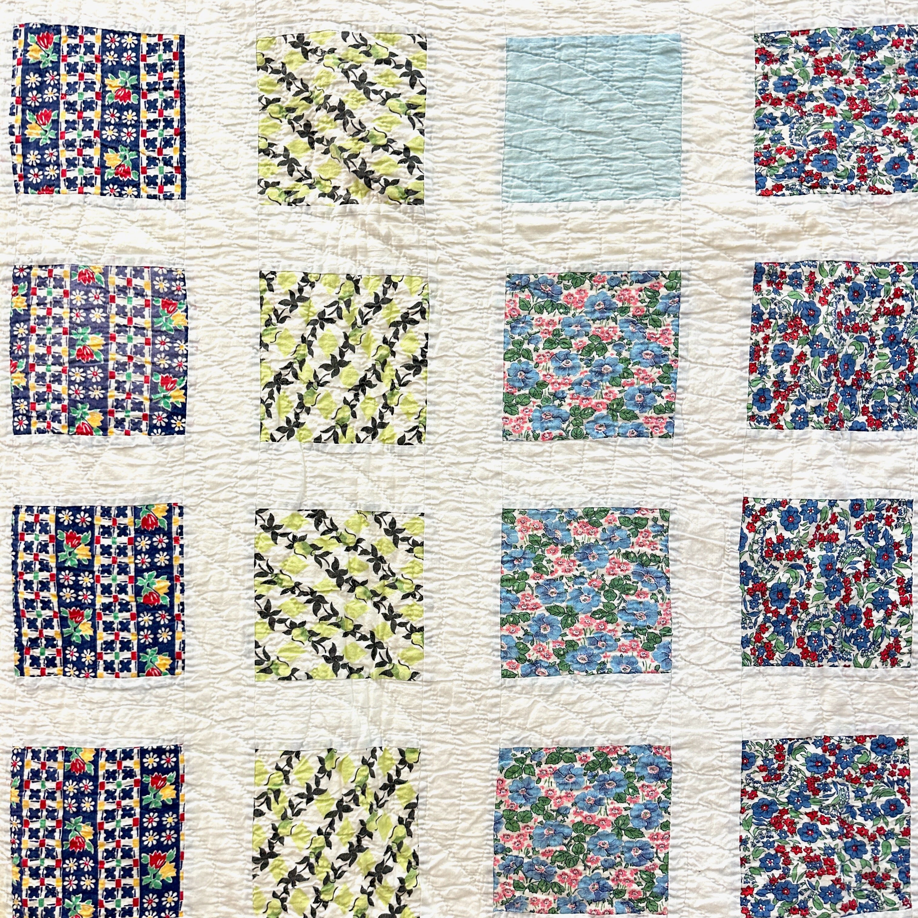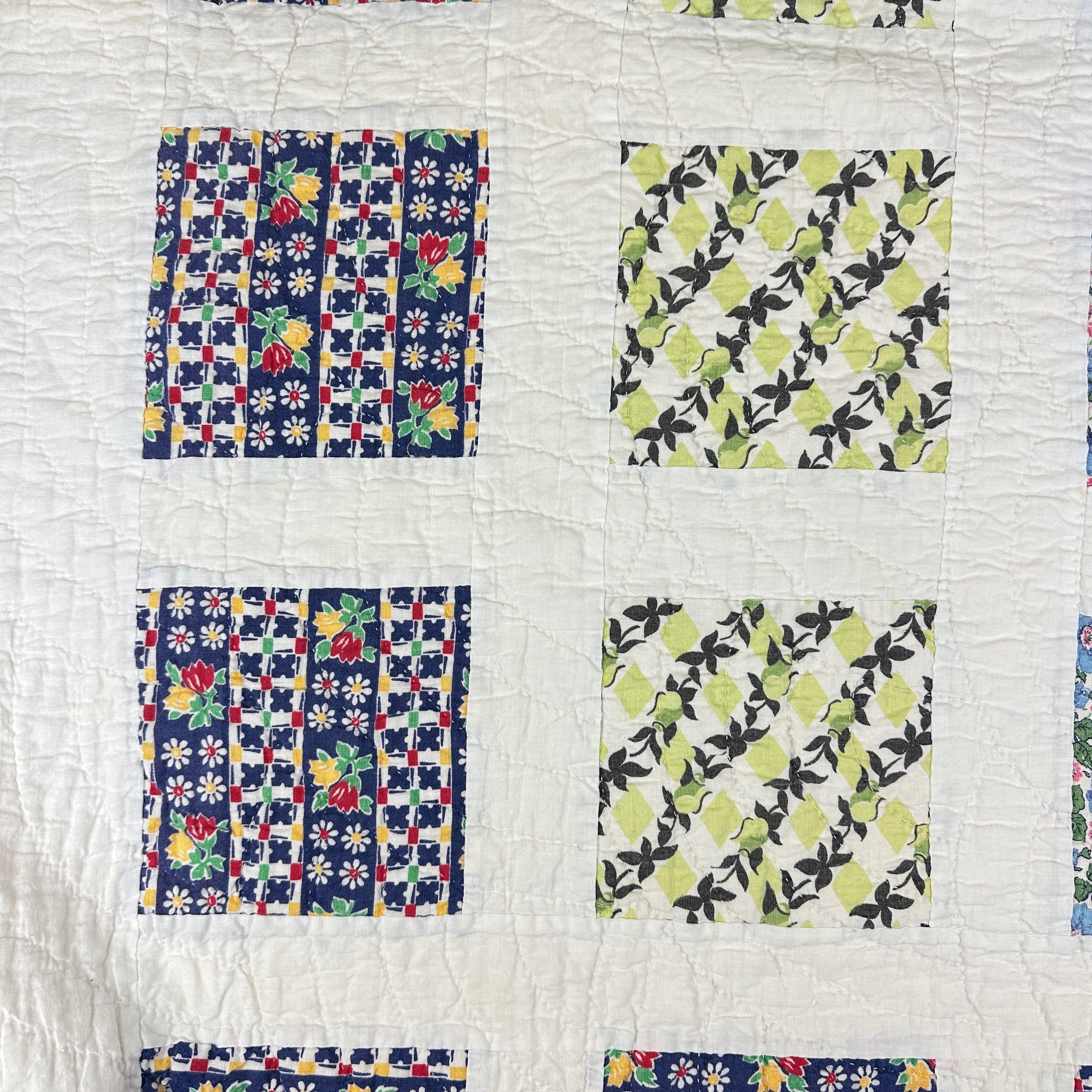 From the 1930s-40s, this vintage patchwork quilt features a block grid pattern. It is made of flour sack cloth with blue florals and a yellow pattern that looks like pears or lemons. It is all hand sewn and hand quilted. This is a lightweight quilt with a thin inner layer of batting. It is in overall good vintage condition free of holes, and shattering, with one open seam along one edge, one strip of discoloration, and a few small spots.