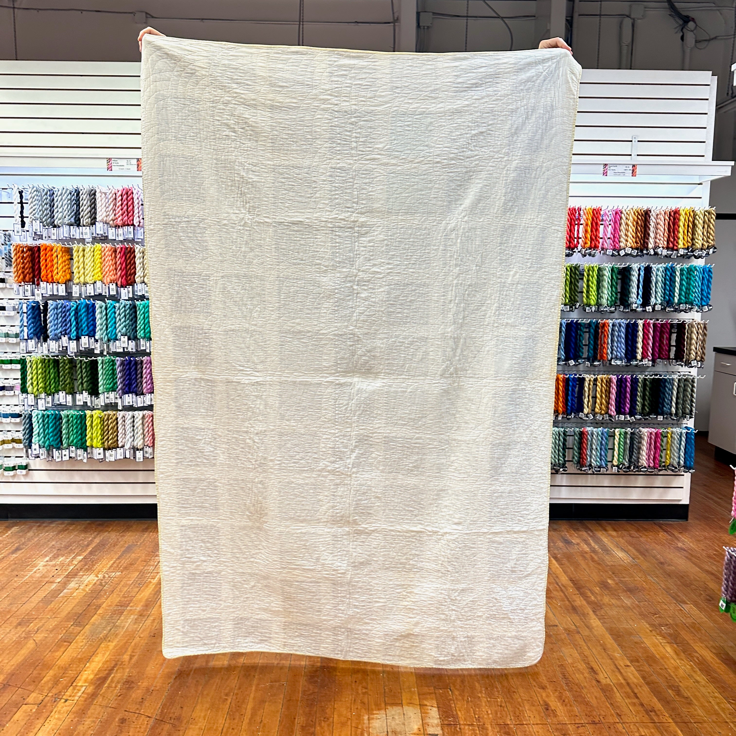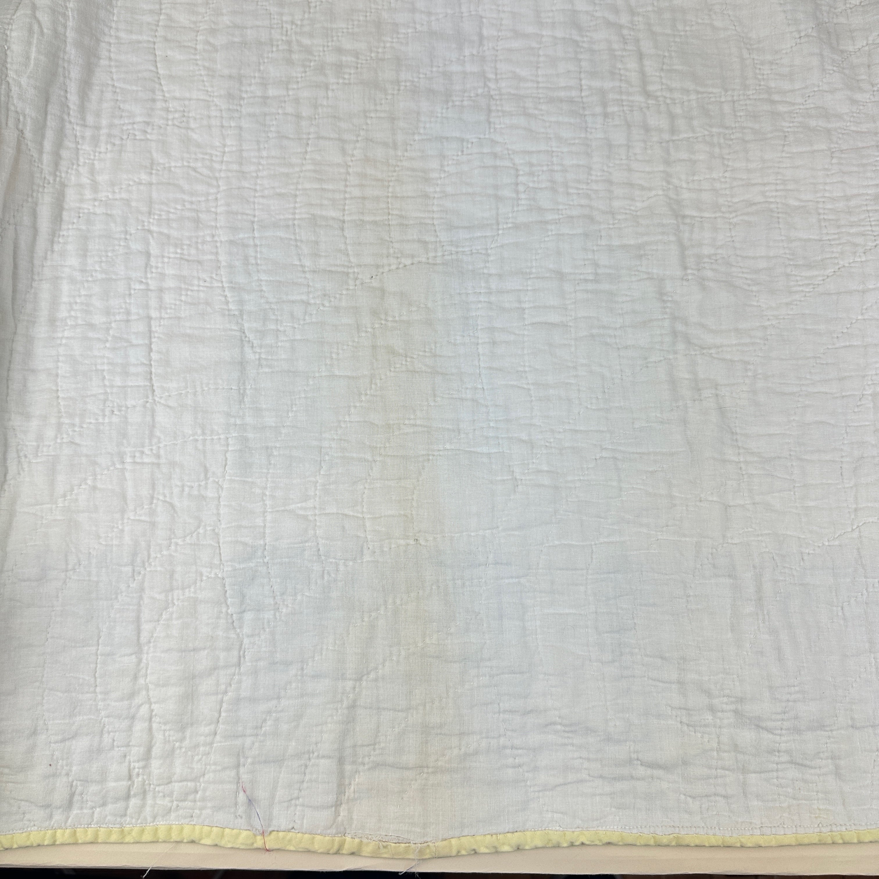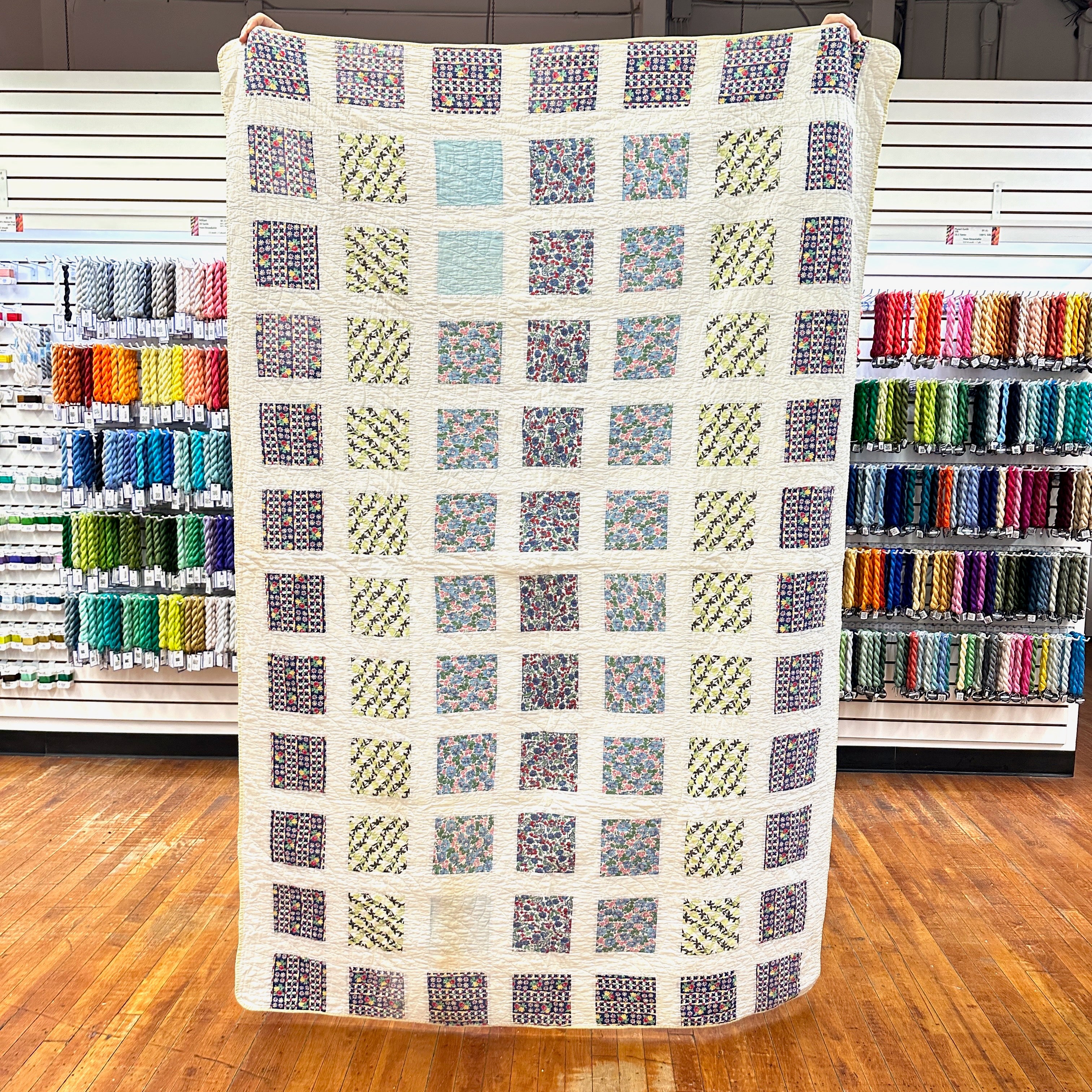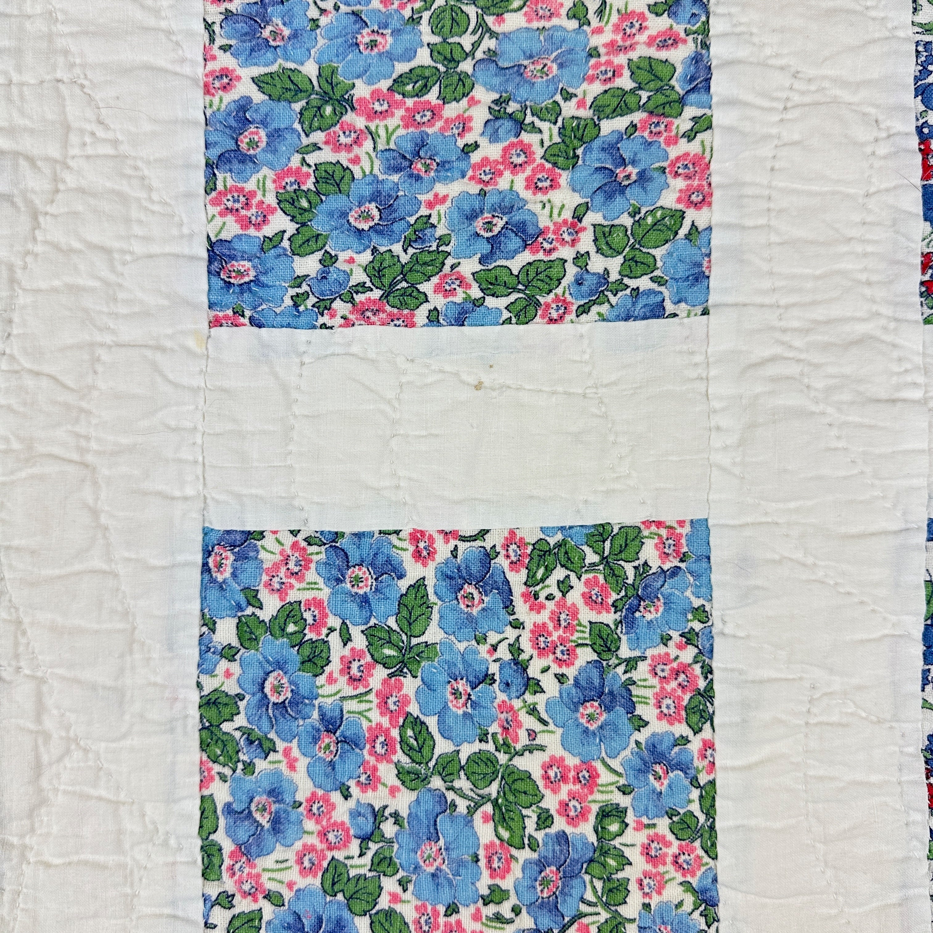From the 1930s-40s, this vintage patchwork quilt features a block grid pattern. It is made of flour sack cloth with blue florals and a yellow pattern that looks like pears or lemons. It is all hand sewn and hand quilted. This is a lightweight quilt with a thin inner layer of batting. It is in overall good vintage condition free of holes, and shattering, with one open seam along one edge, one strip of discoloration, and a few small spots.