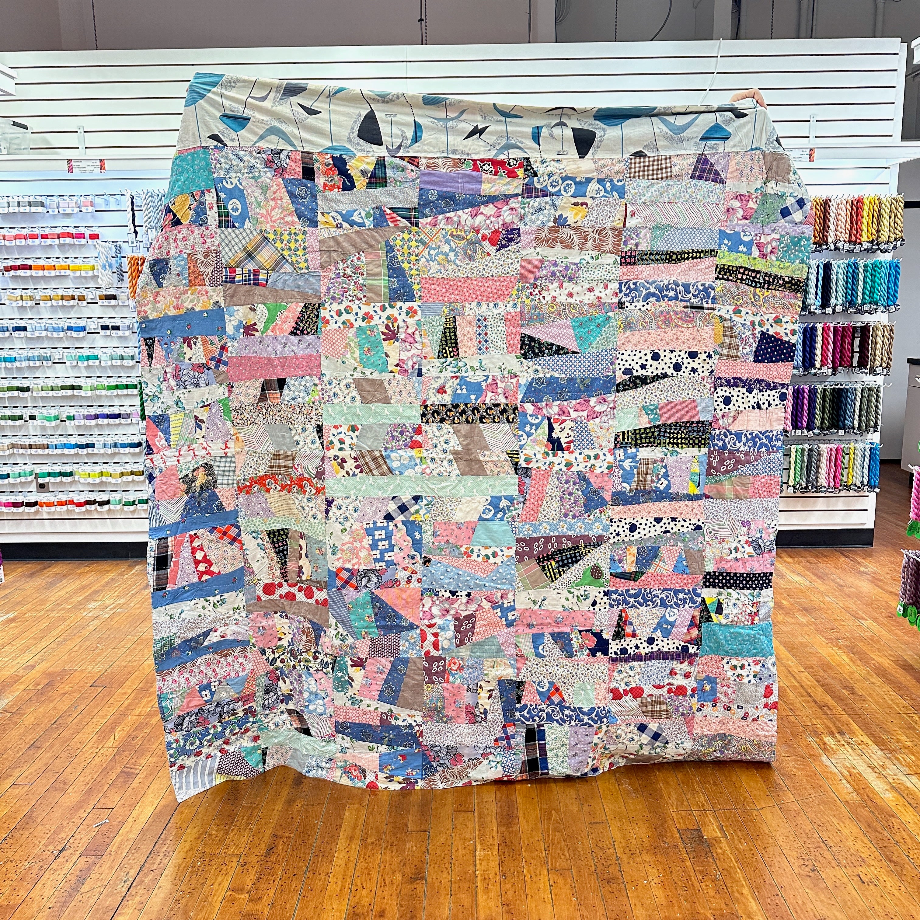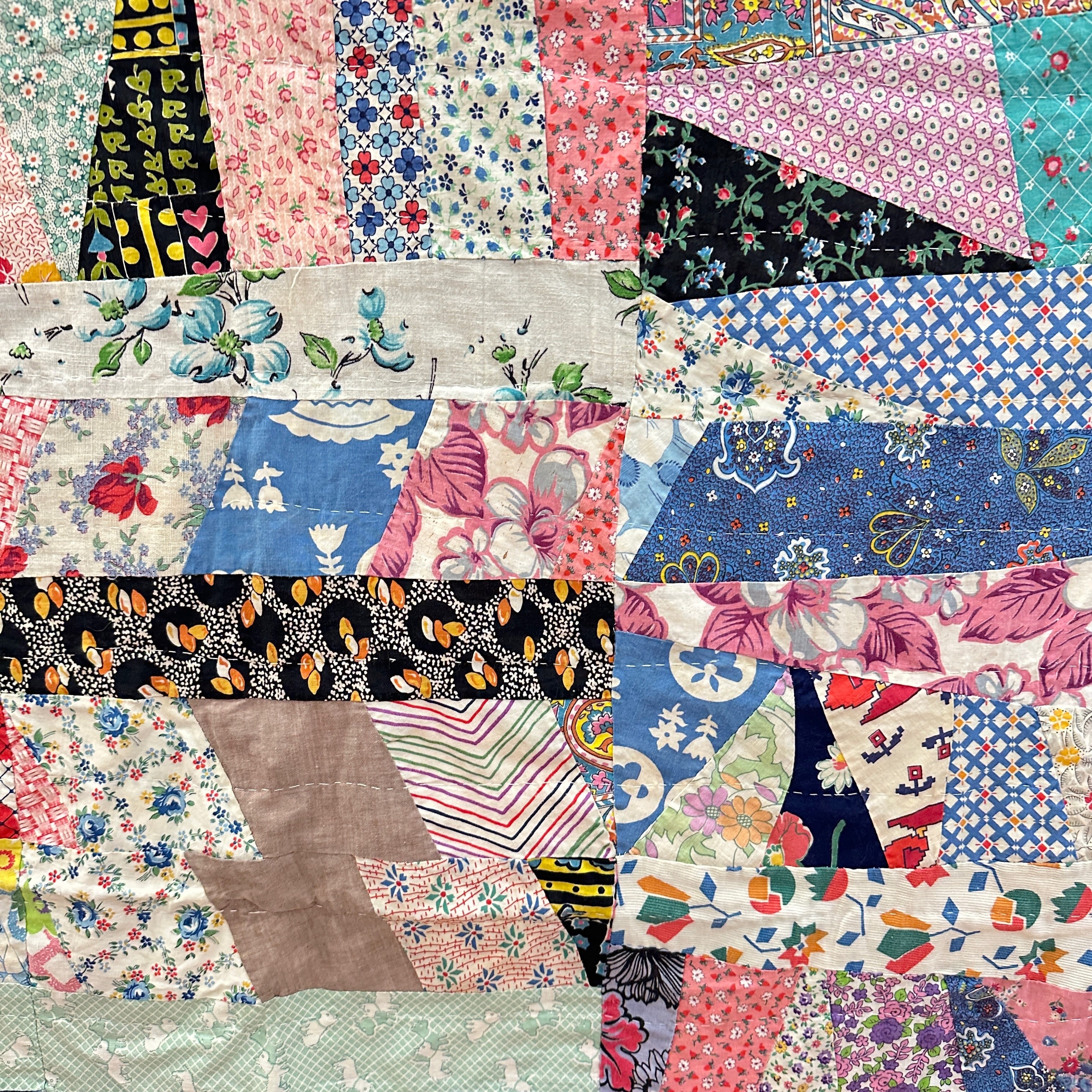 This beauty has been in my personal collection, but I'm ready to let it go to a new home. From the 1940s-50s, it is a real stunner with two fully patchworked sides. One side is a crazy quilt and the other features a composed cube pattern. It is very colorful, made of all cottons in a wide variety of prints - lots of florals and a handful of novelty prints including people dancing, cats, and bears playing instruments. It was hand sewn and hand quilted. It's a lightweight quilt with probably just a piece of cotton fabric as an inner layer. It is in good vintage condition free of loose seams, holes or shattering. Nice bright colors with only a few spots which are hardly noticeable.