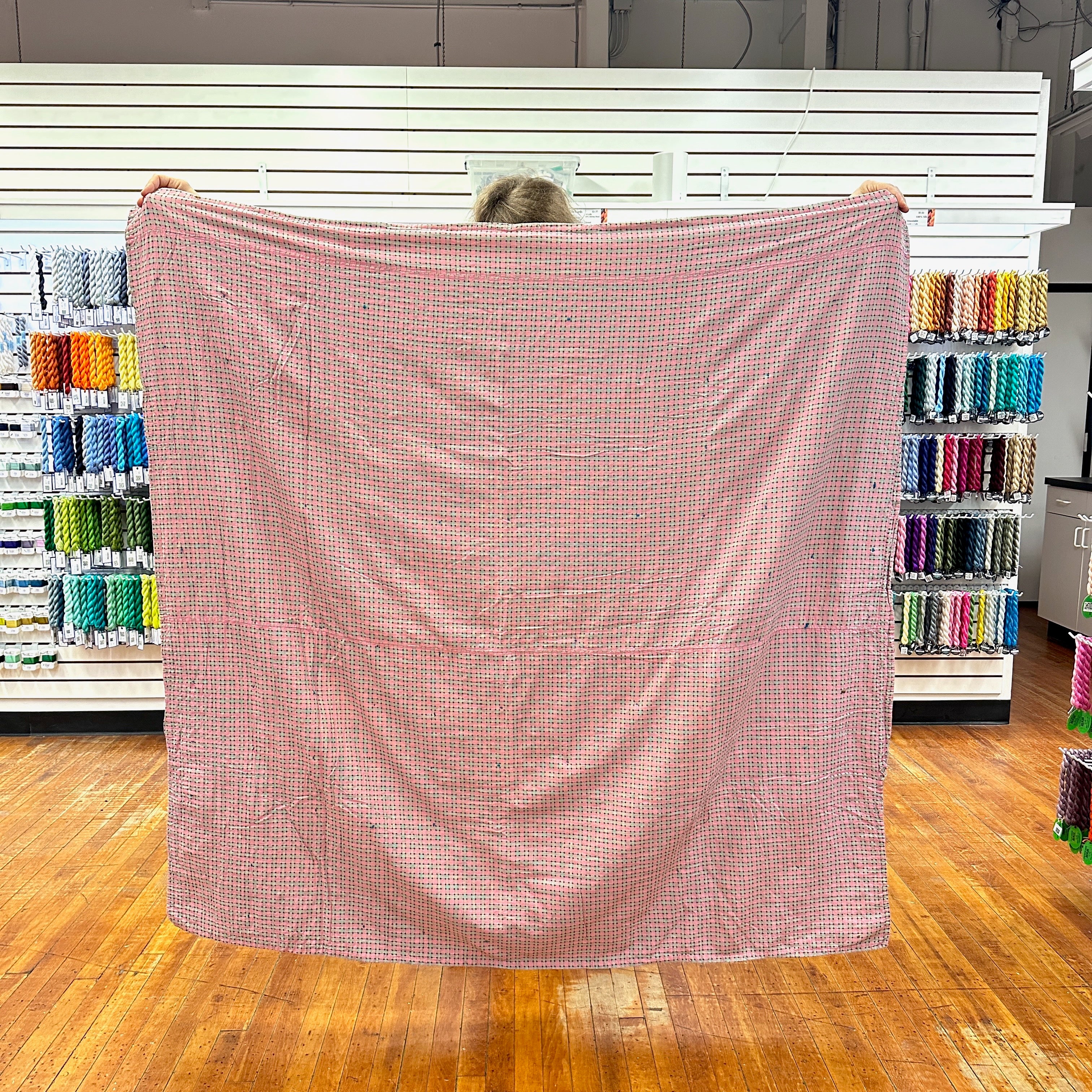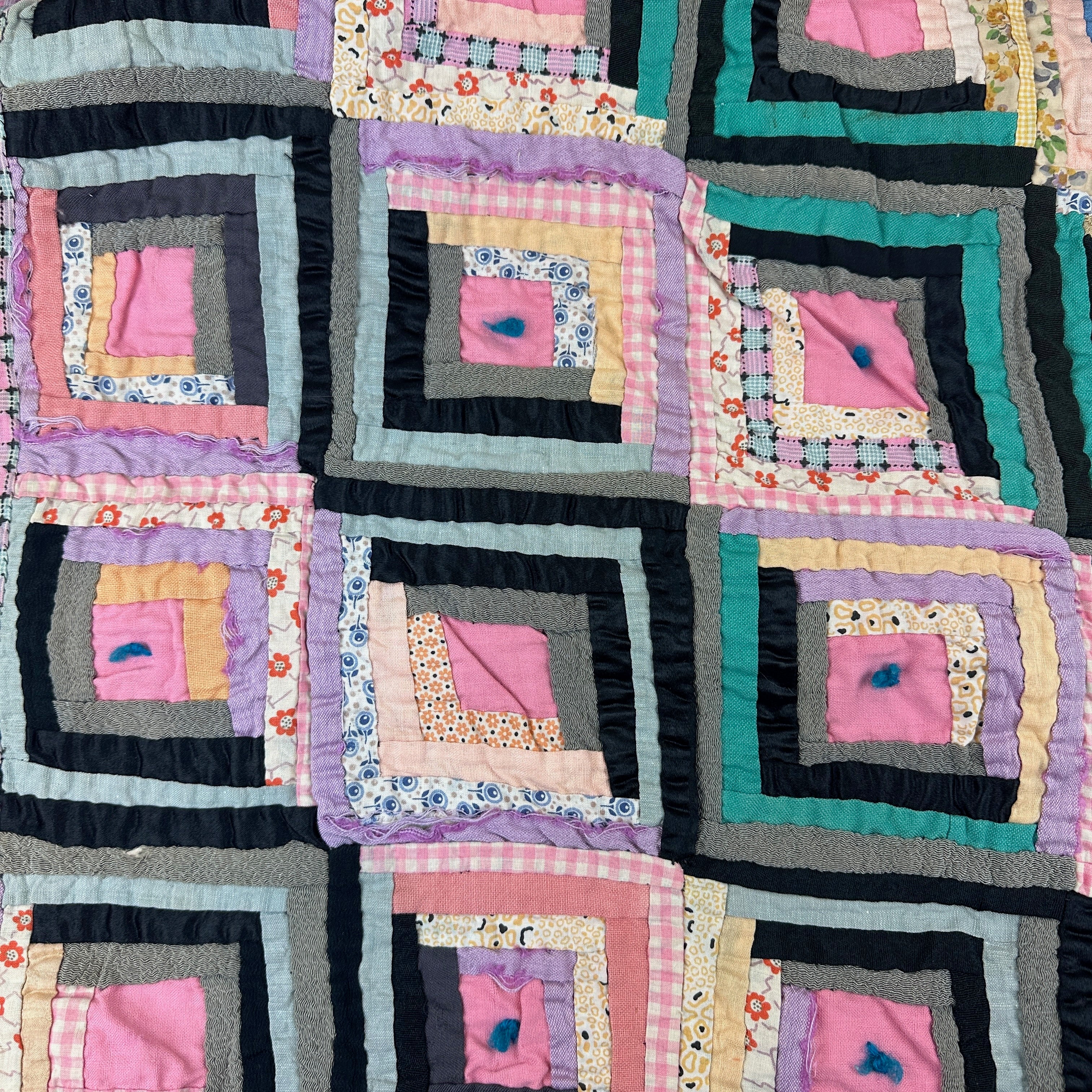 From the 1940s-50s, this vintage quilt features a log cabin pattern. It is made of a wide variety of fabrics including cotton, wool, satin, velvet, and rayon. It's a mix of muted colors paired with soft pinks and peach. It is backed in a pink plaid. It was hand sewn and then tied with blue yarn. Of course, some of the fabrics held up better than others. The nap on the velvets has largely worn off, there is a scattering of shattered patches, and a few small spots.