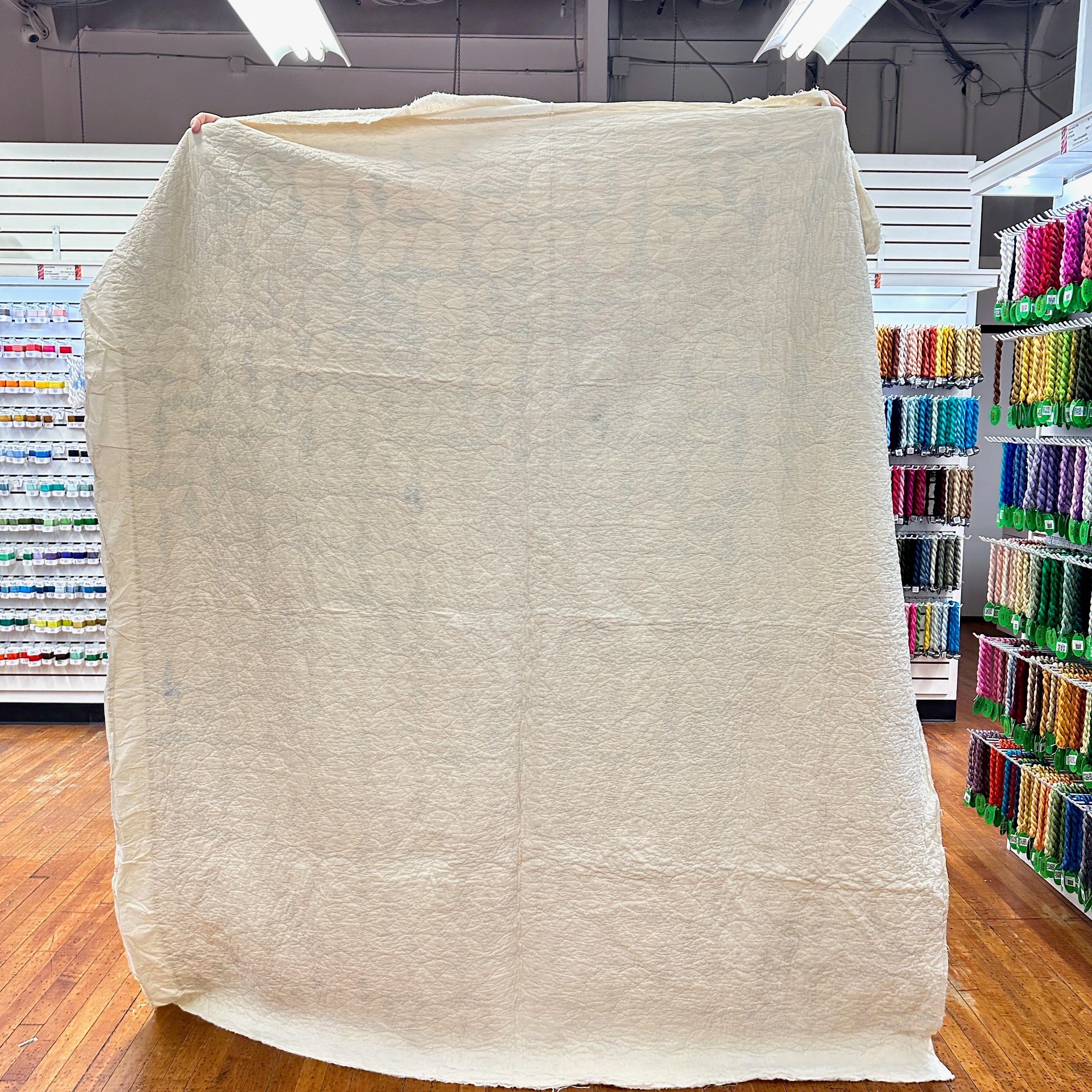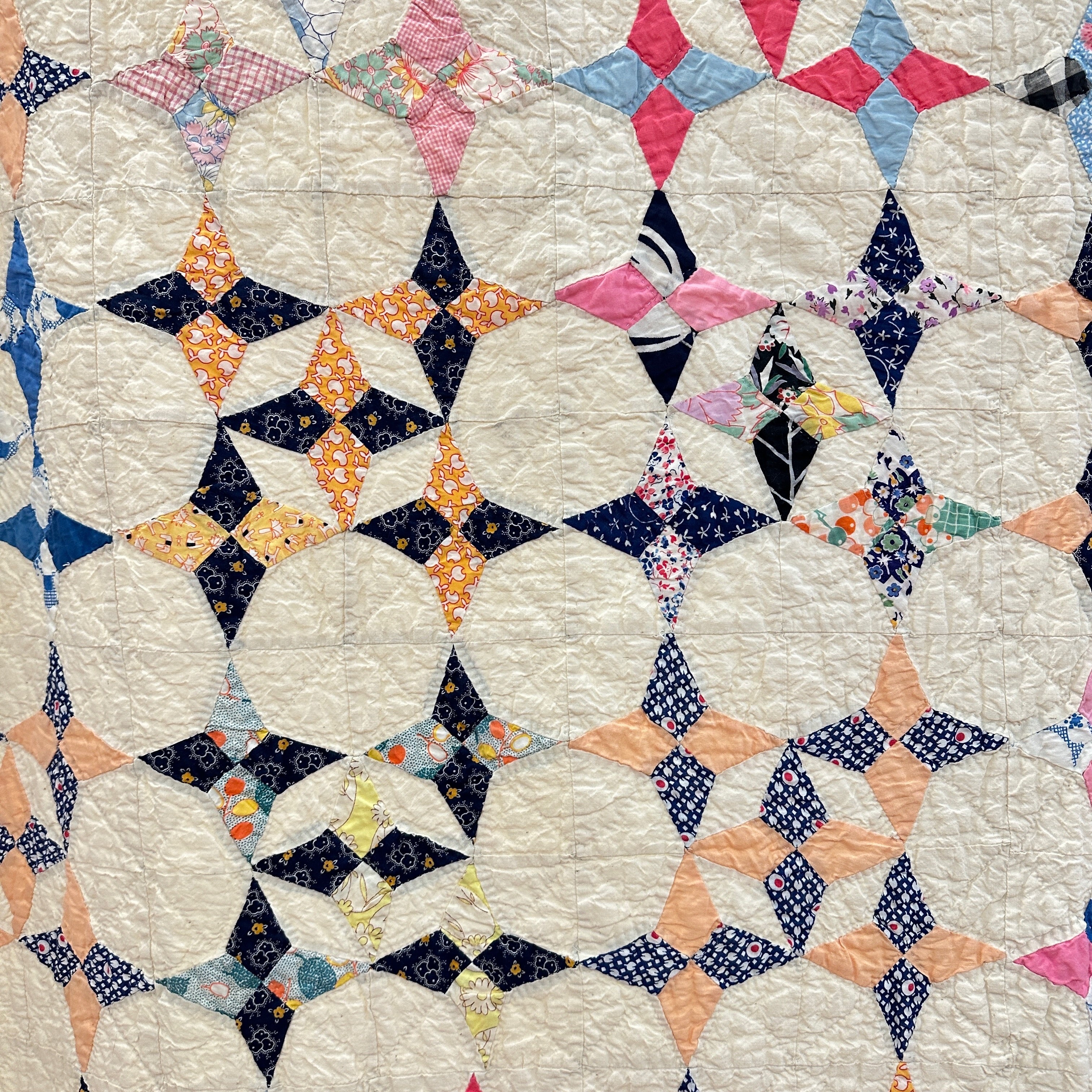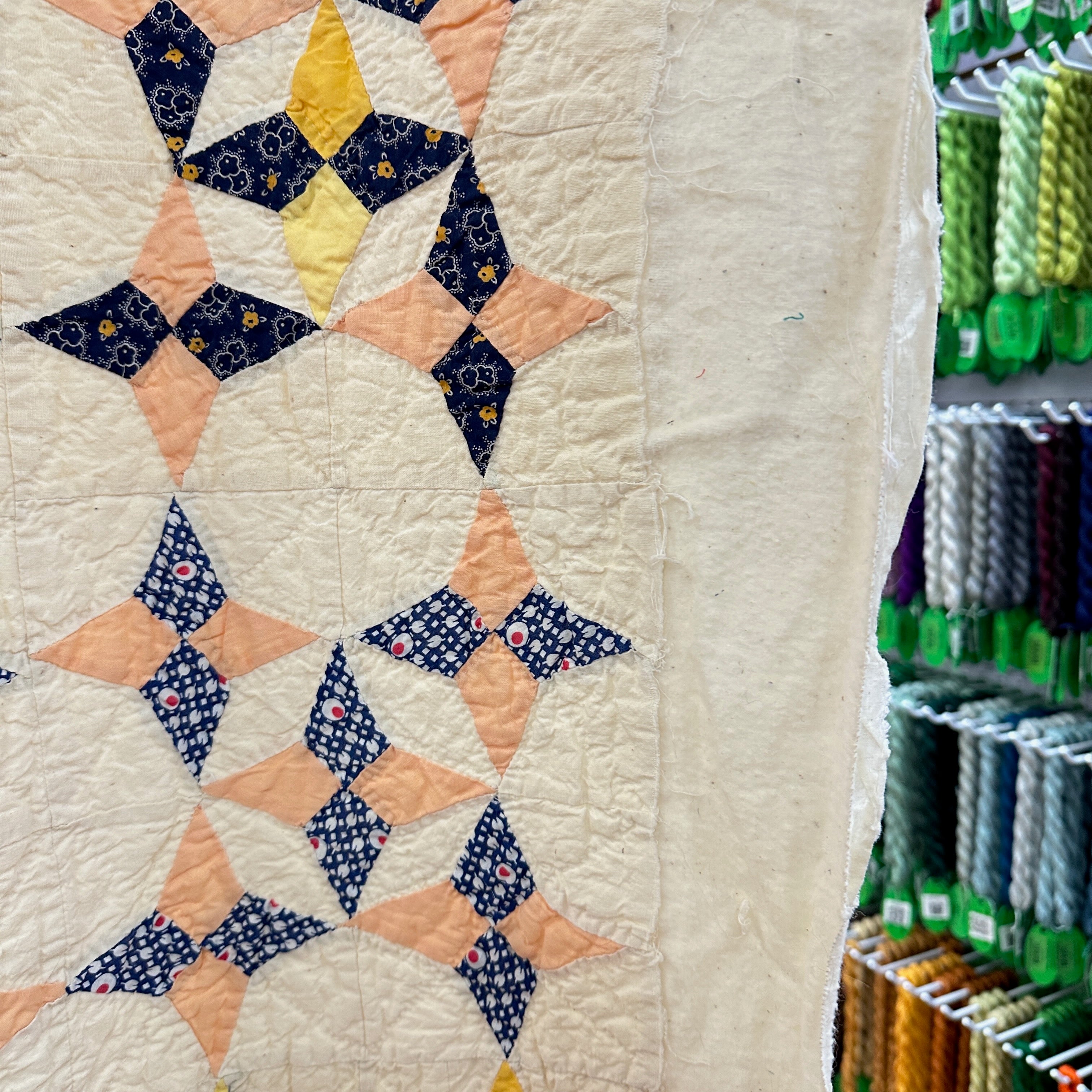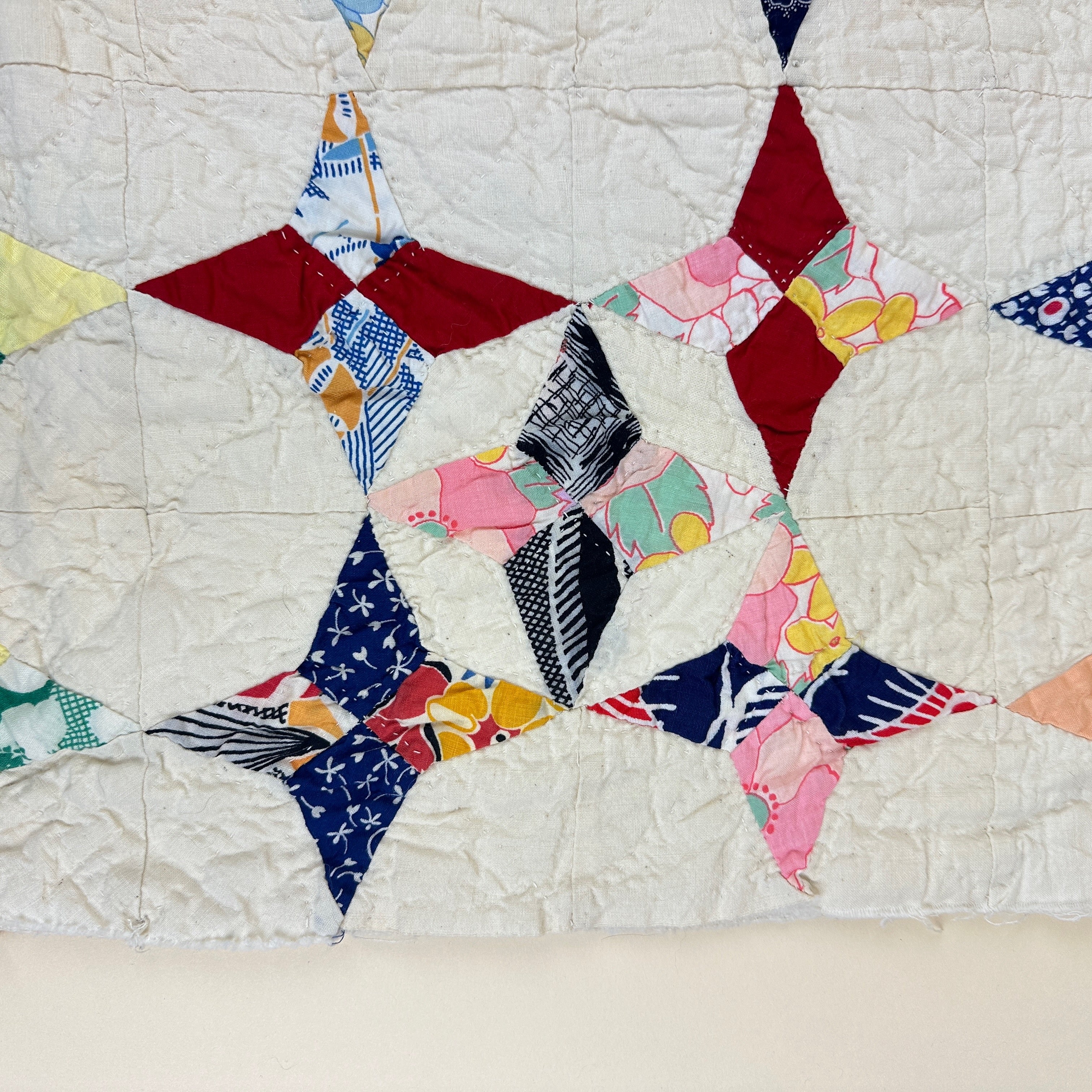 From the 1930s-40s, this patchwork quilt features a pretty star pattern with clusters of 5, four pointed stars. It is made of colorful feedsack cloth and other cottons in a variety of floral and geometric patterns and solids. It is a medium weight quilt with a warm inner layer of flannel and cotton muslin backing. It is all hand sewn and hand quilted, but the binding around the edges was never finished. It's in good vintage condition free of loose seams, holes or shattering, with some light age toning and a few small spots normal for age.