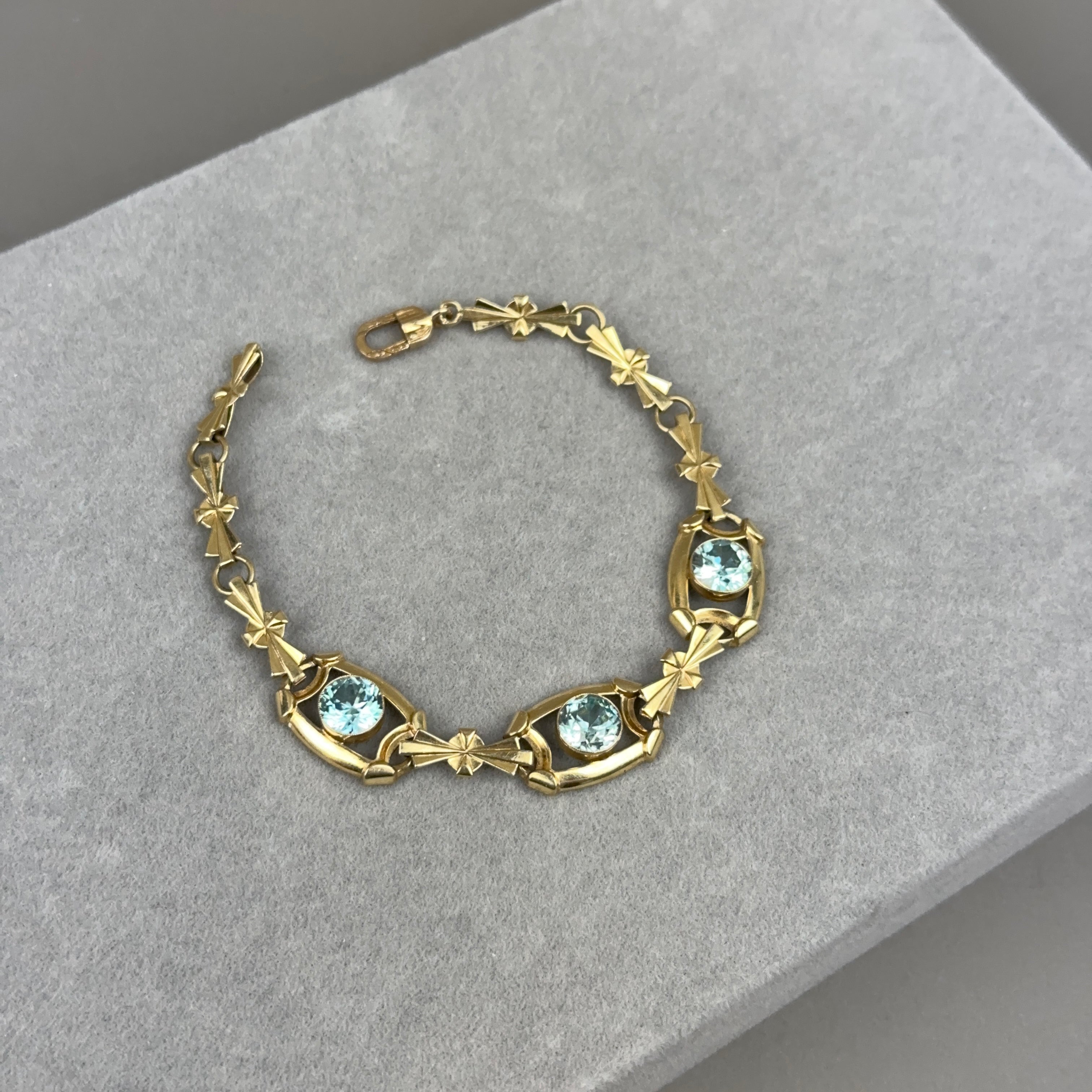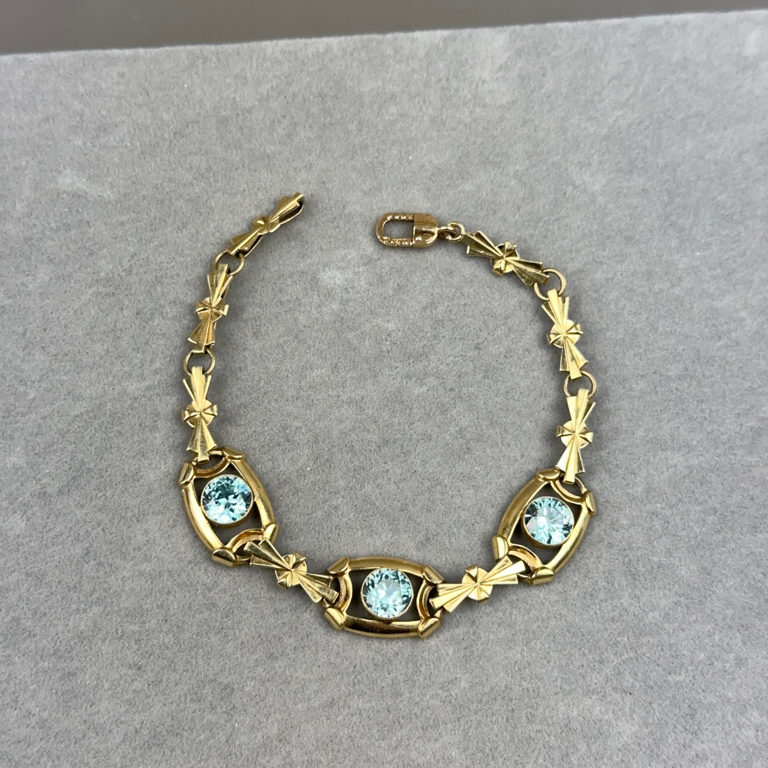 From the 1940s, this 14k gold link bracelet features a retro design with ribbon and bow motifs. It is set with sparkling blue Zircon.