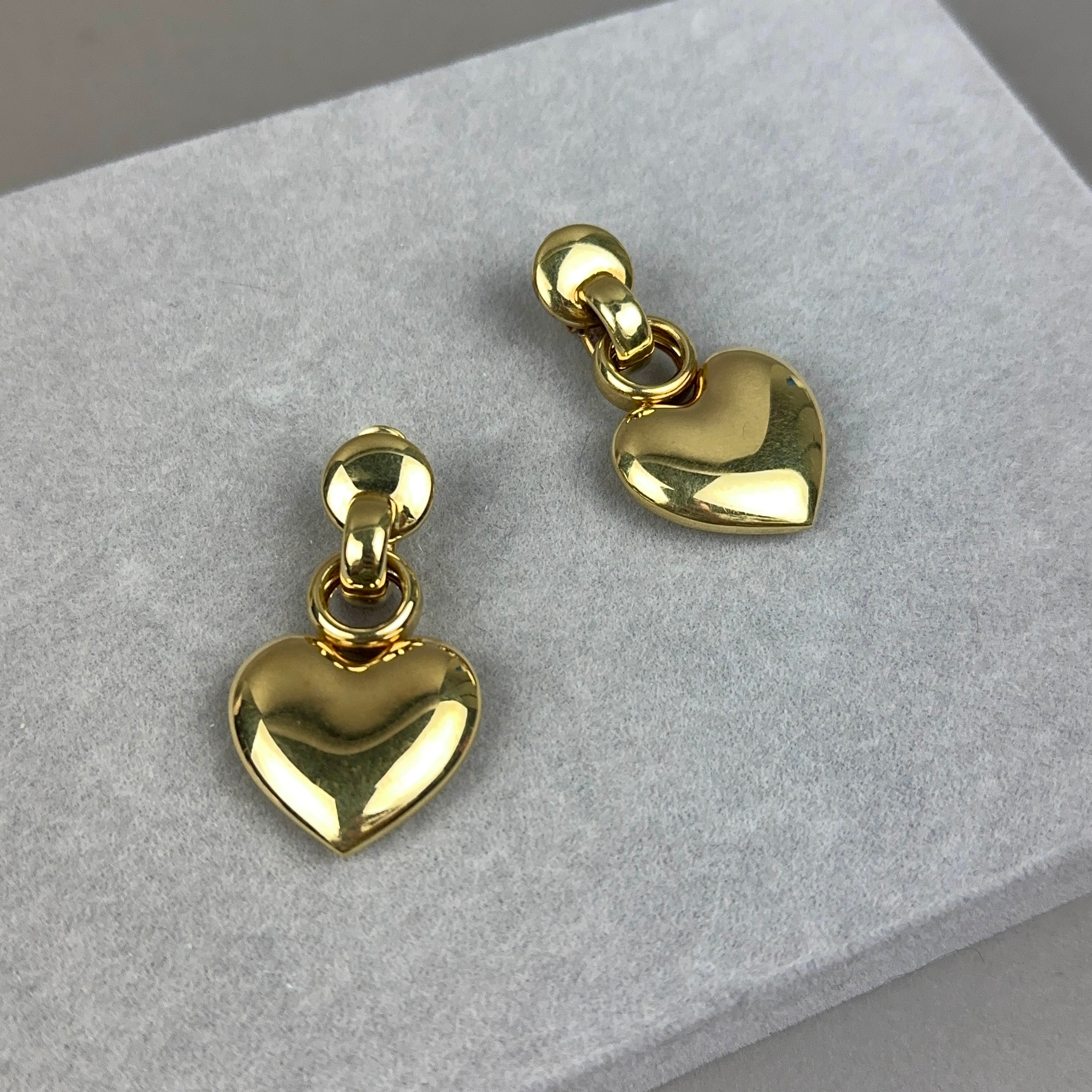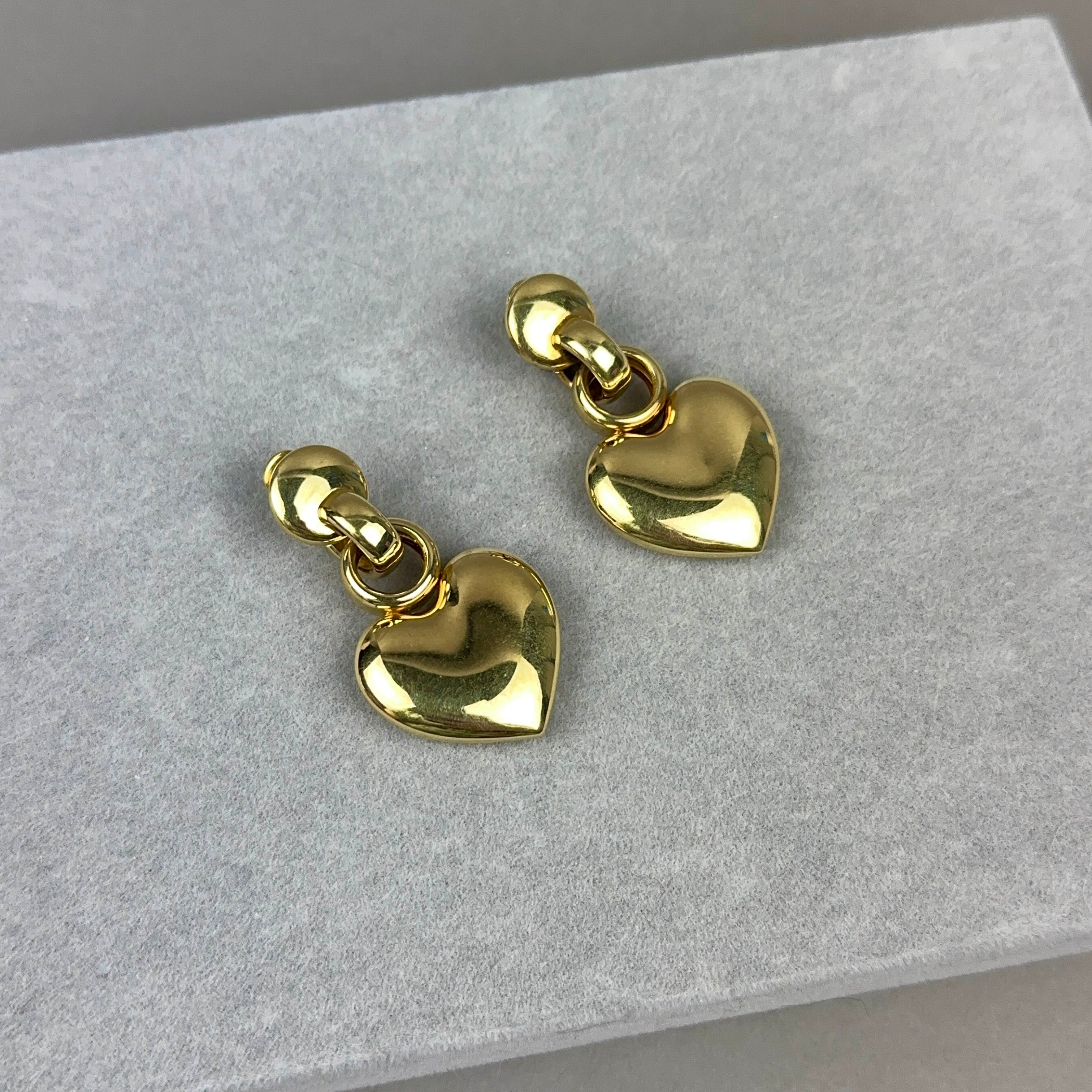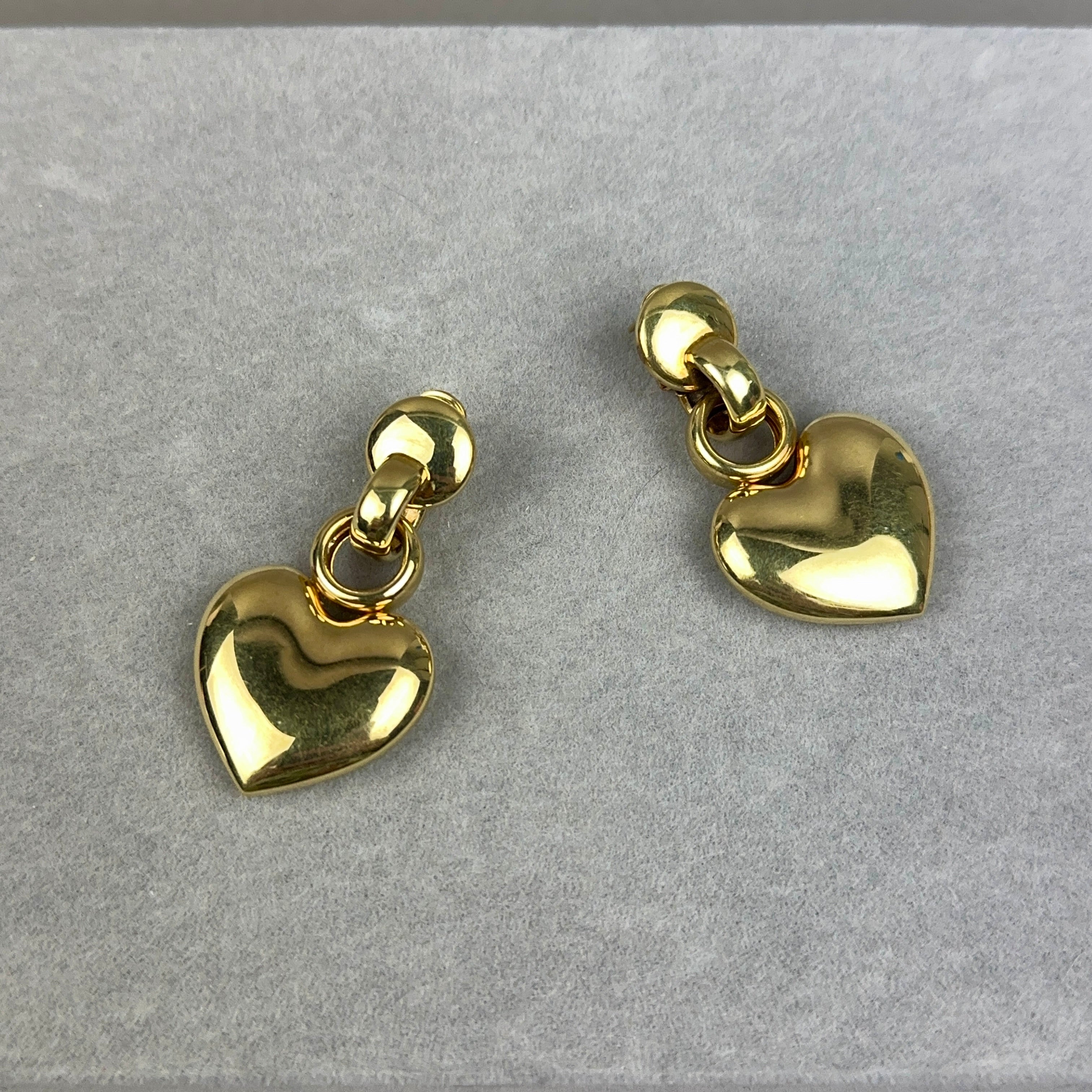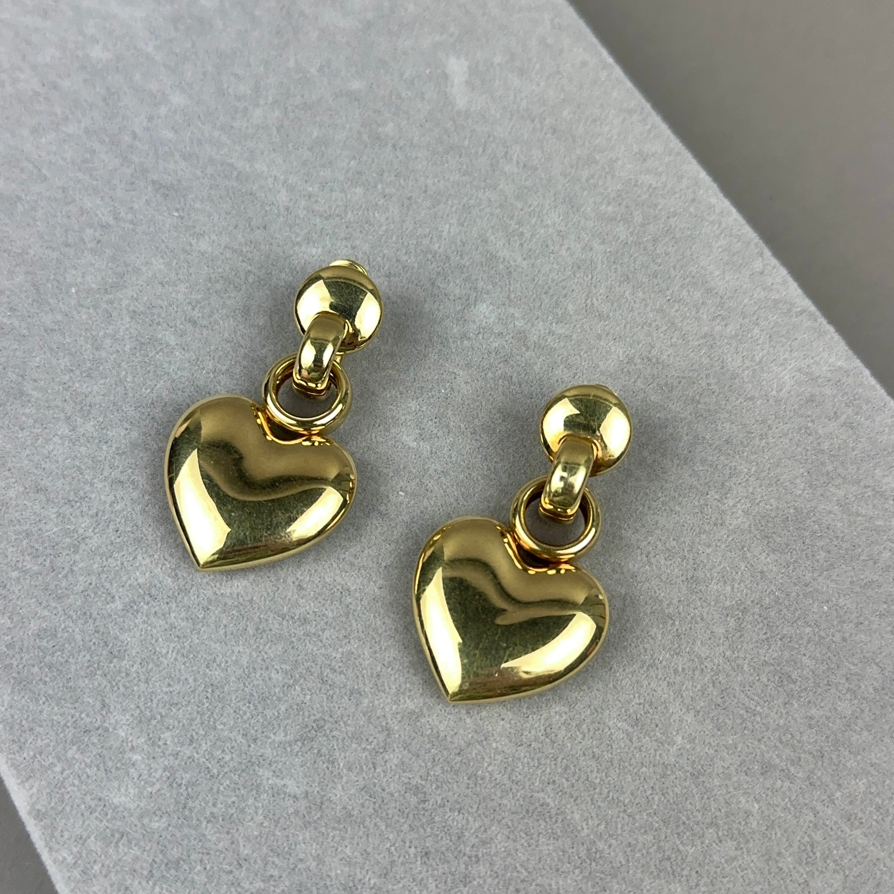 These bold 14k gold vintage earrings from the 1980s feature large puffy hearts with disk and link tops. They have secure omega post backs. Made in Italy.
