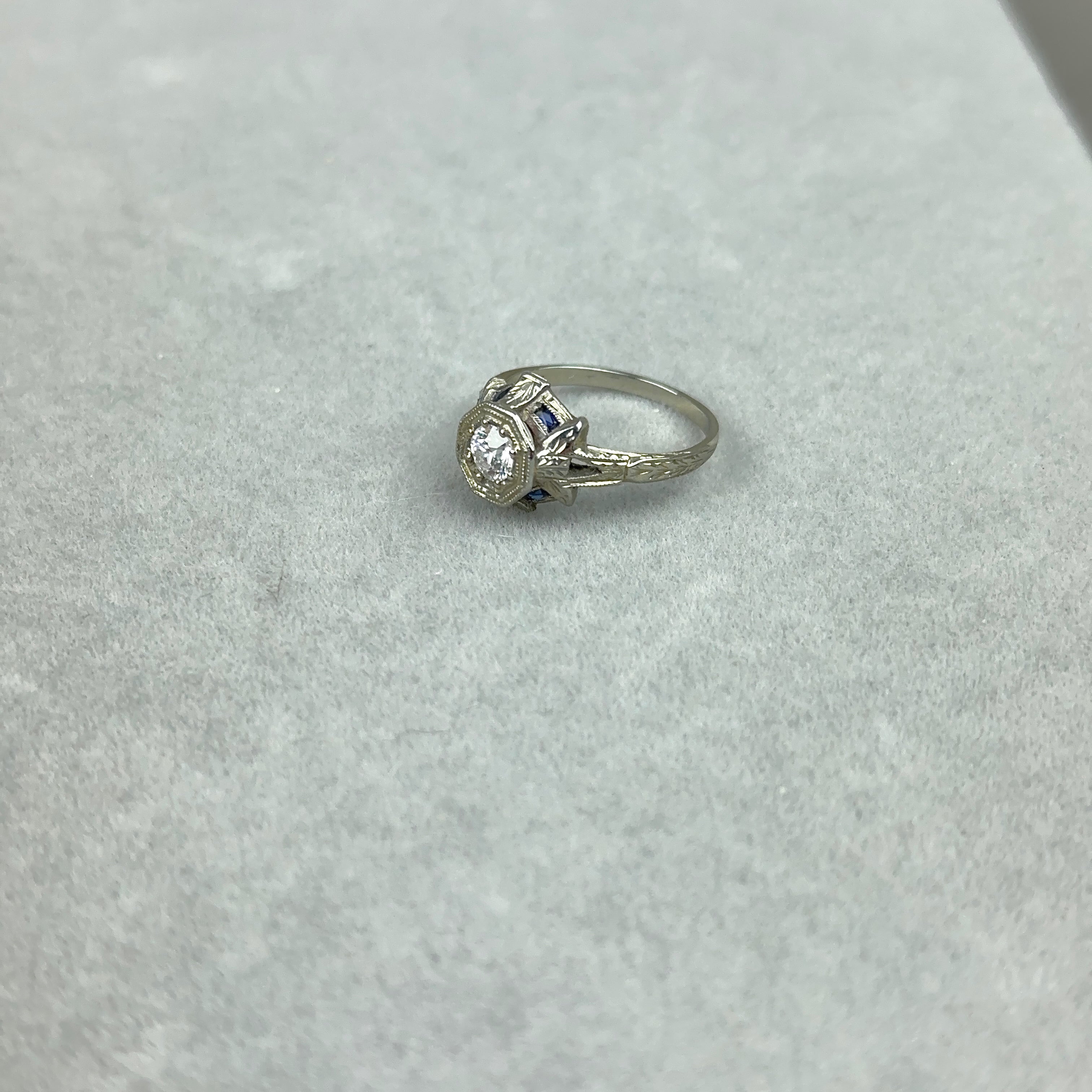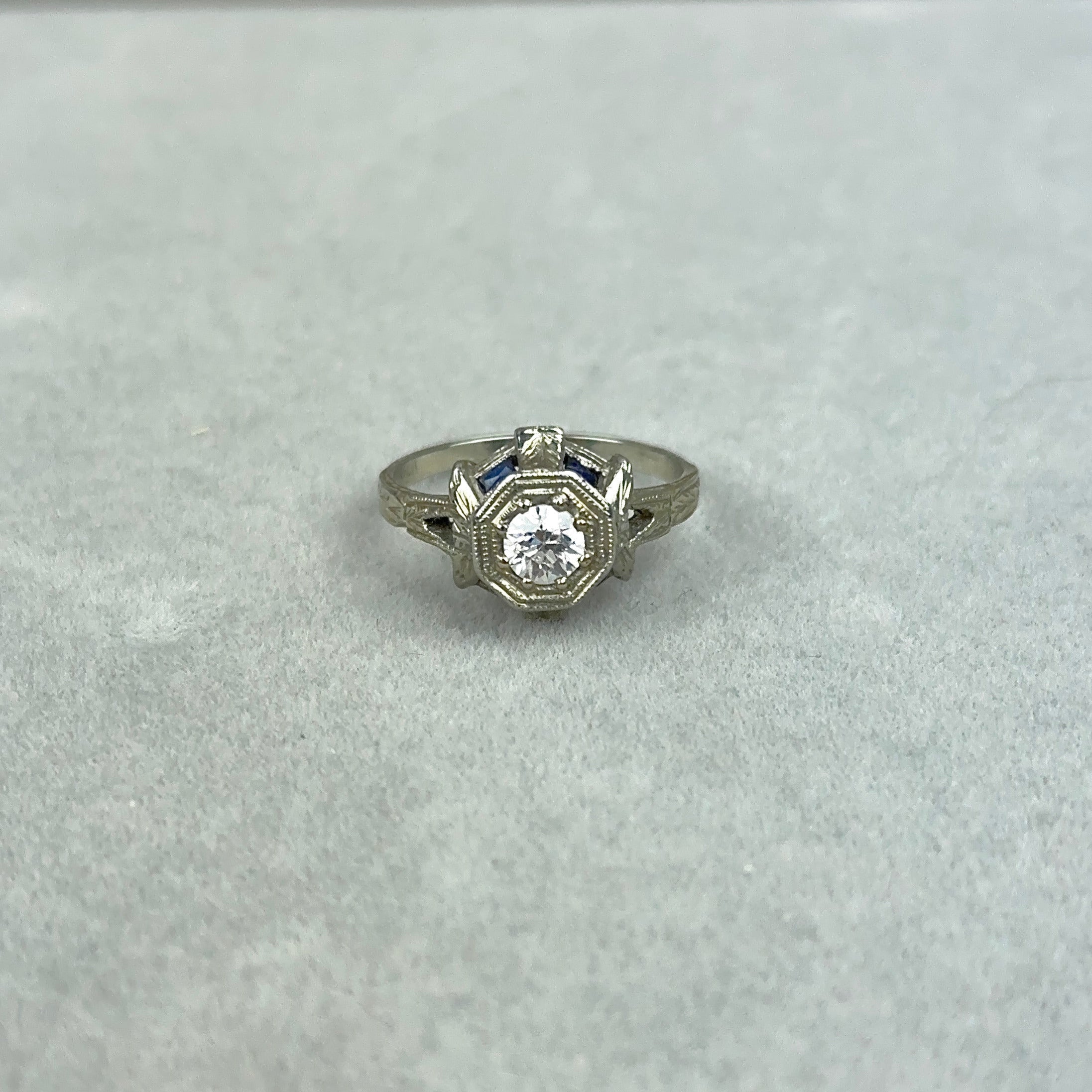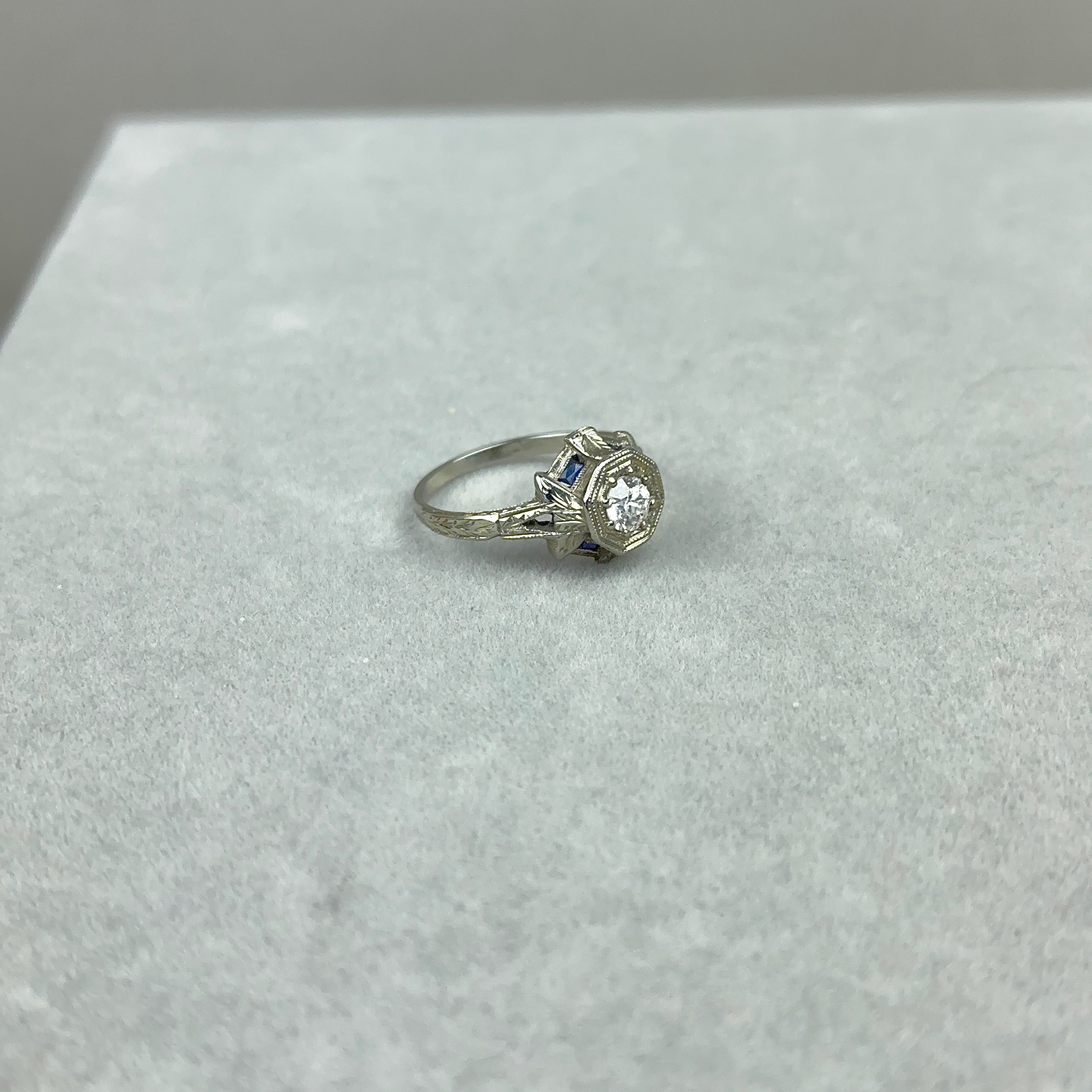 This vintage Art Deco ring from the 1930s features an elegant raised octagonal head with a sparkling milgrain set old mine cut diamond in 18k white gold. It is flanked by French cut lab sapphires in an usual carved mount.