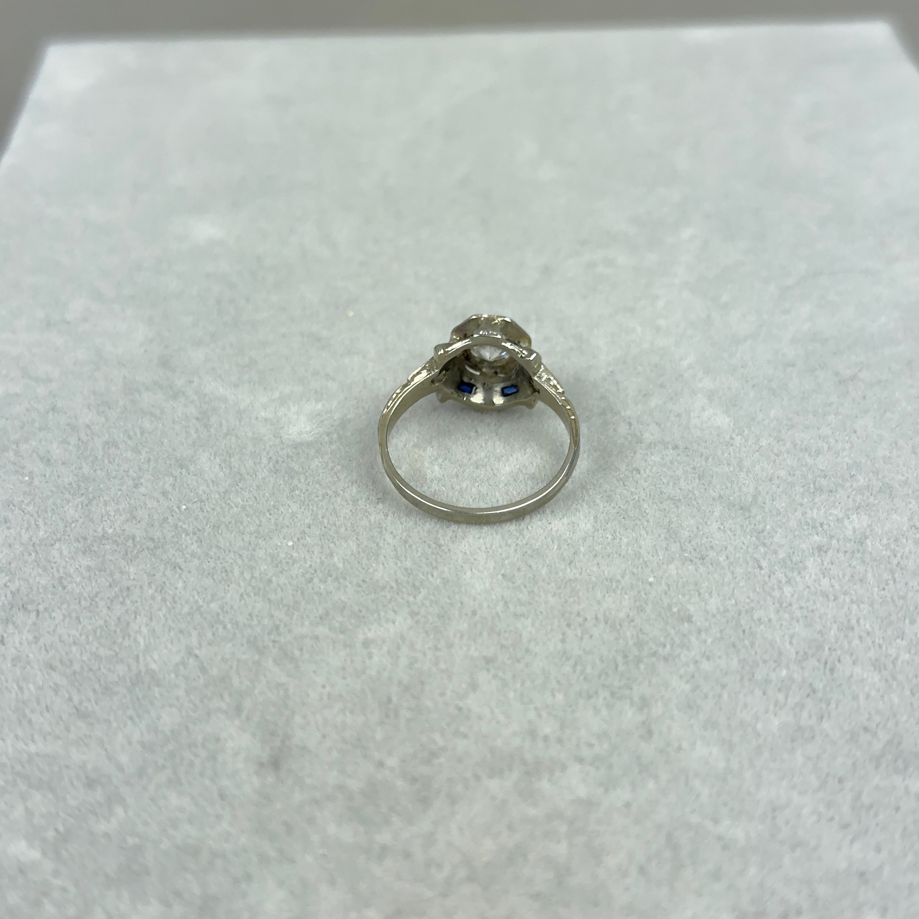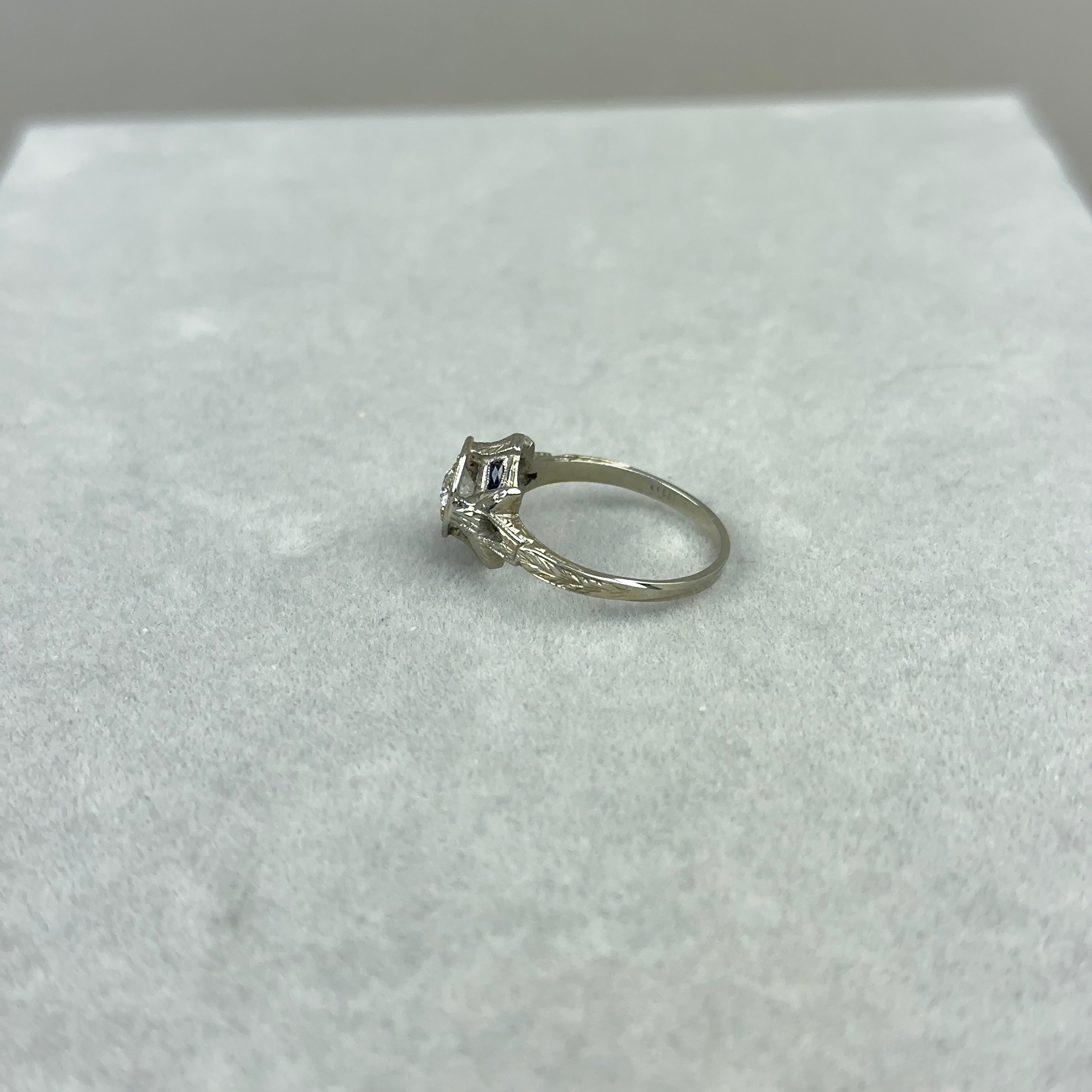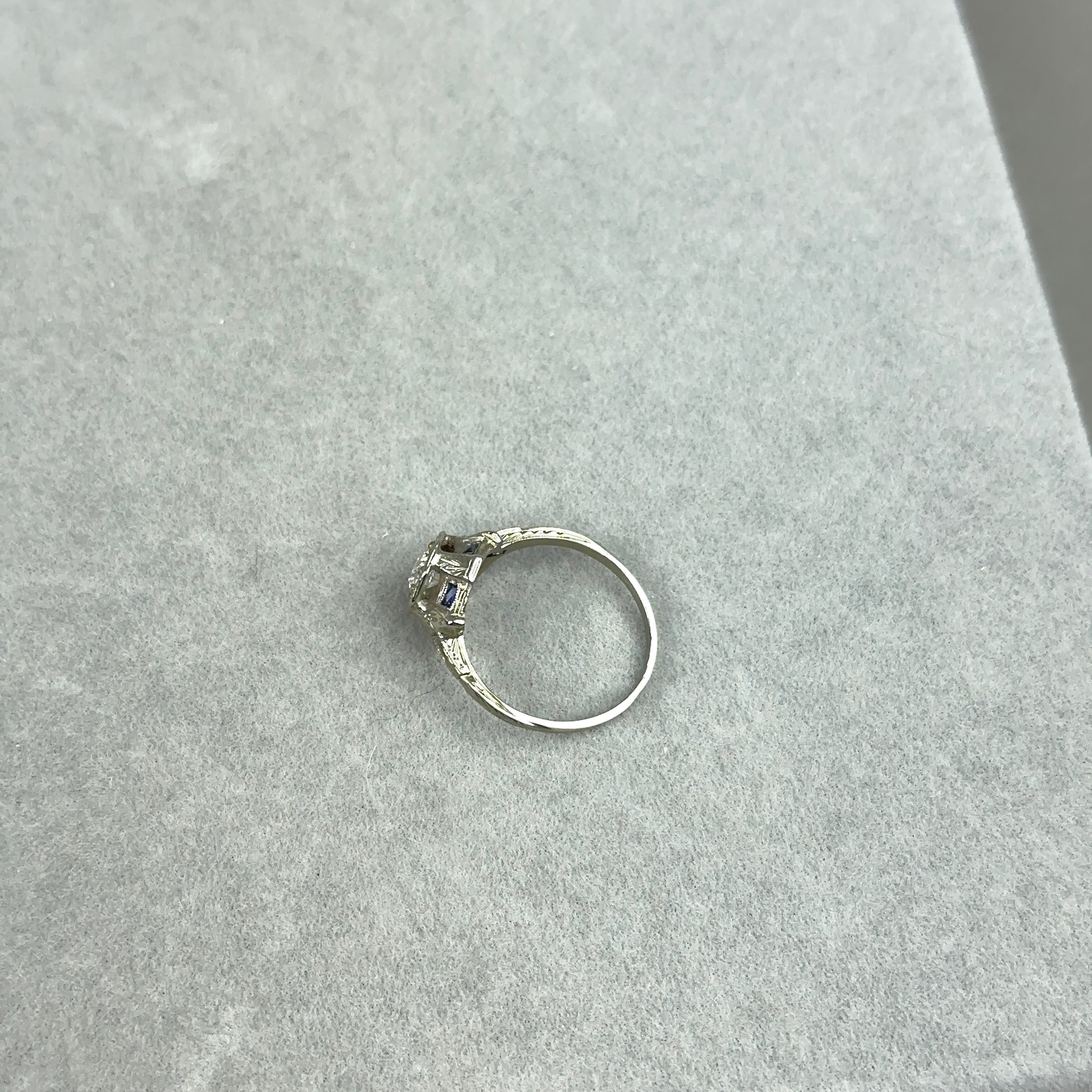 This vintage Art Deco ring from the 1930s features an elegant raised octagonal head with a sparkling milgrain set old mine cut diamond in 18k white gold. It is flanked by French cut lab sapphires in an usual carved mount.