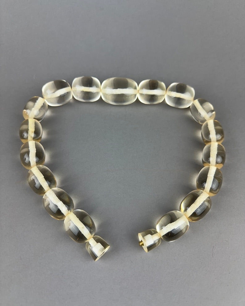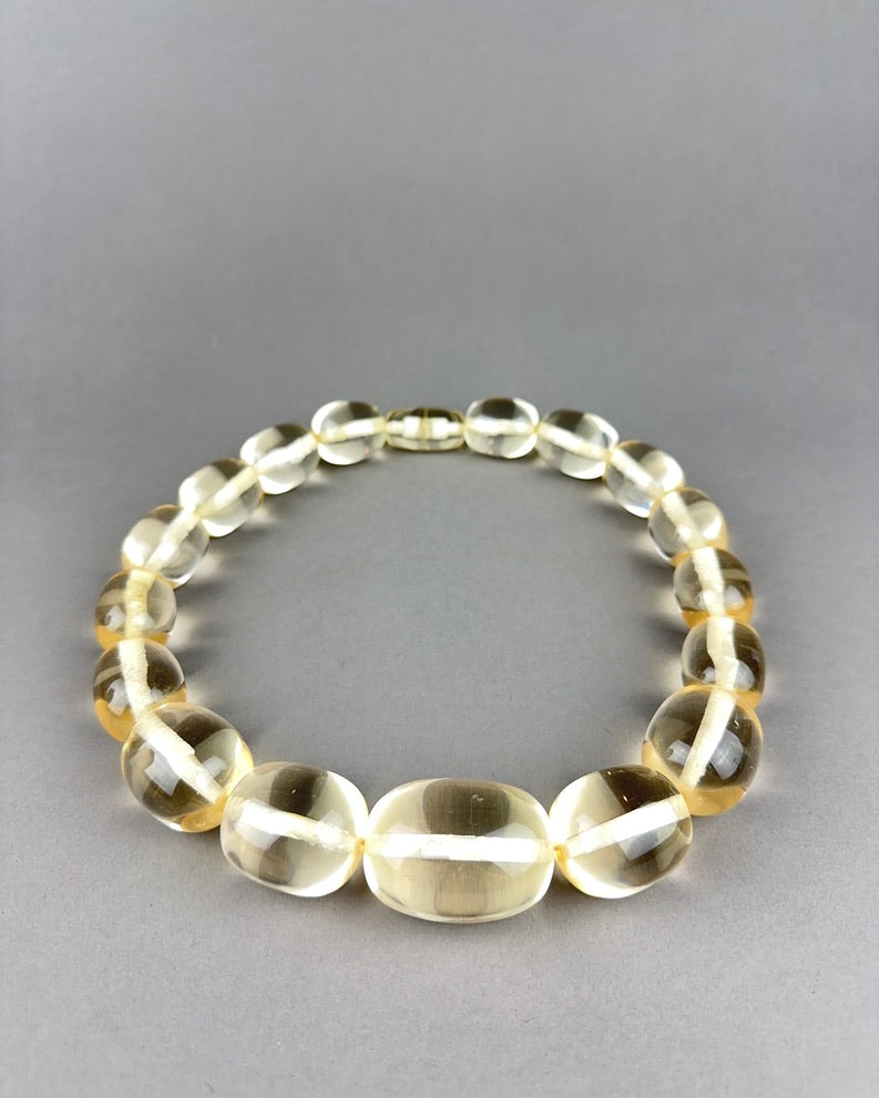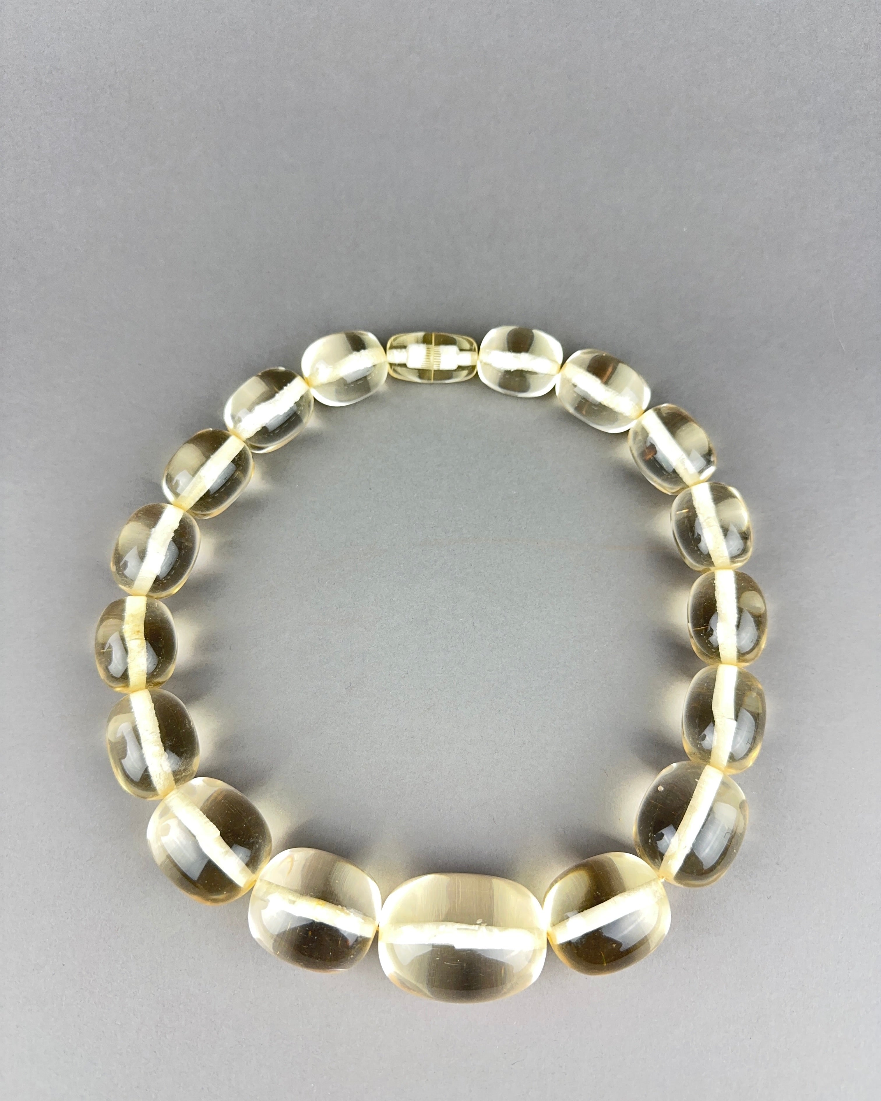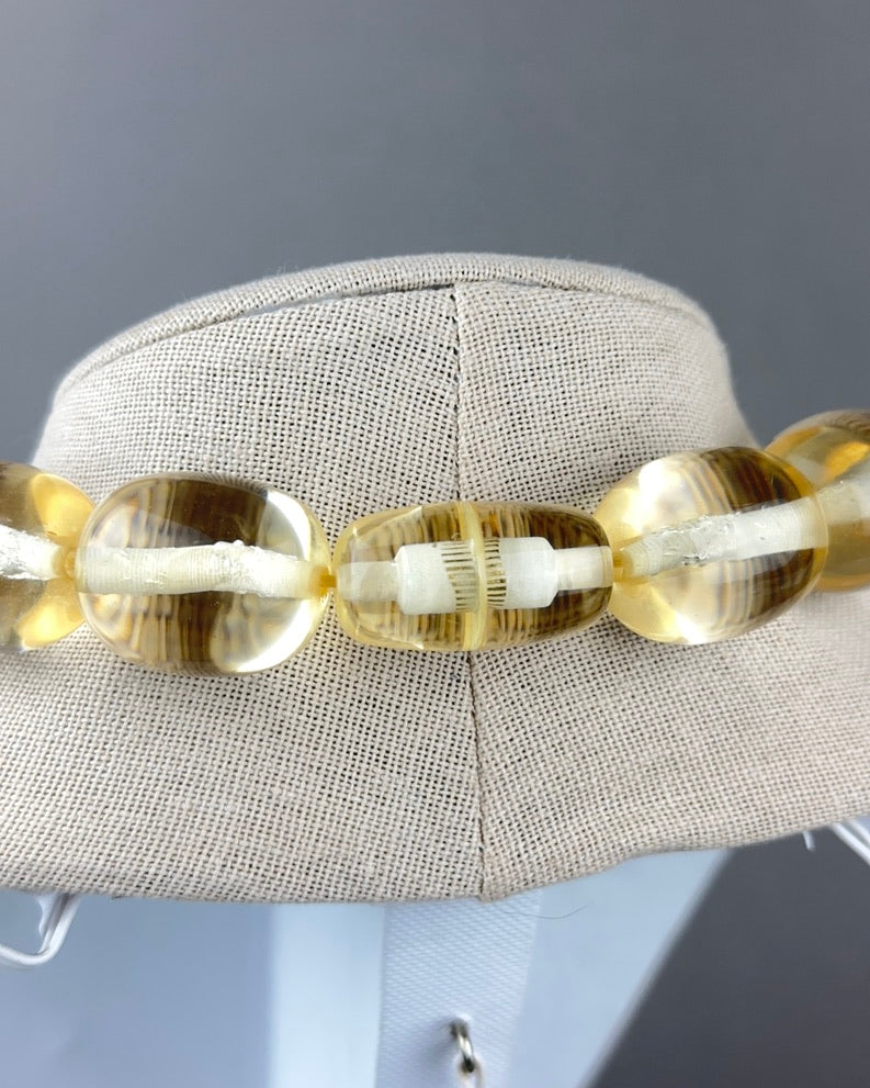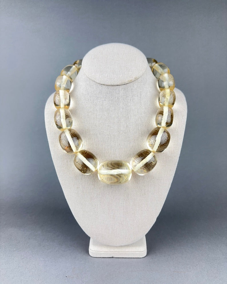 This vintage Lucite bead necklace from the 1960s-70s features bold chunky beads with a hidden twist clasp. It is in good vintage condition showing light wear typical for age.