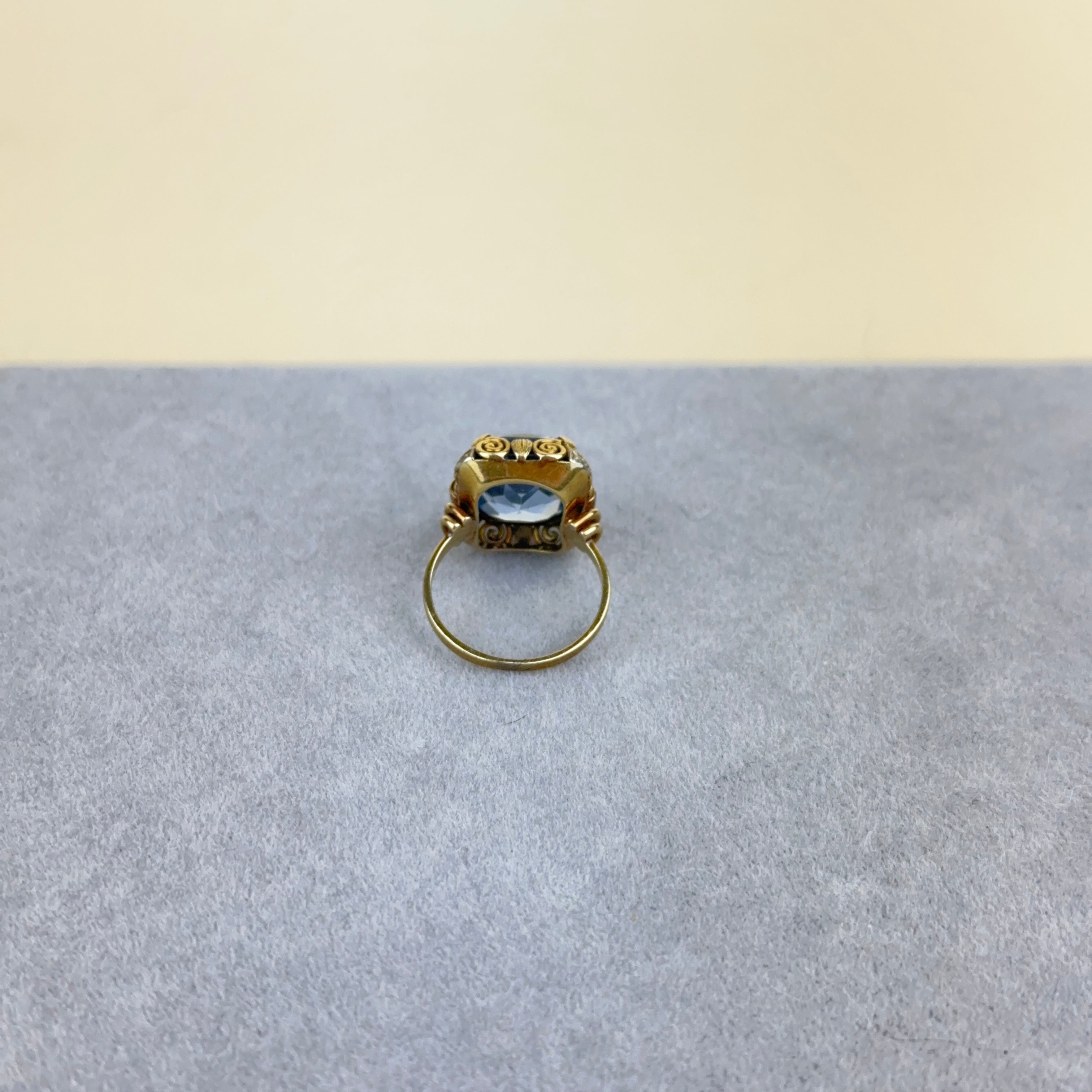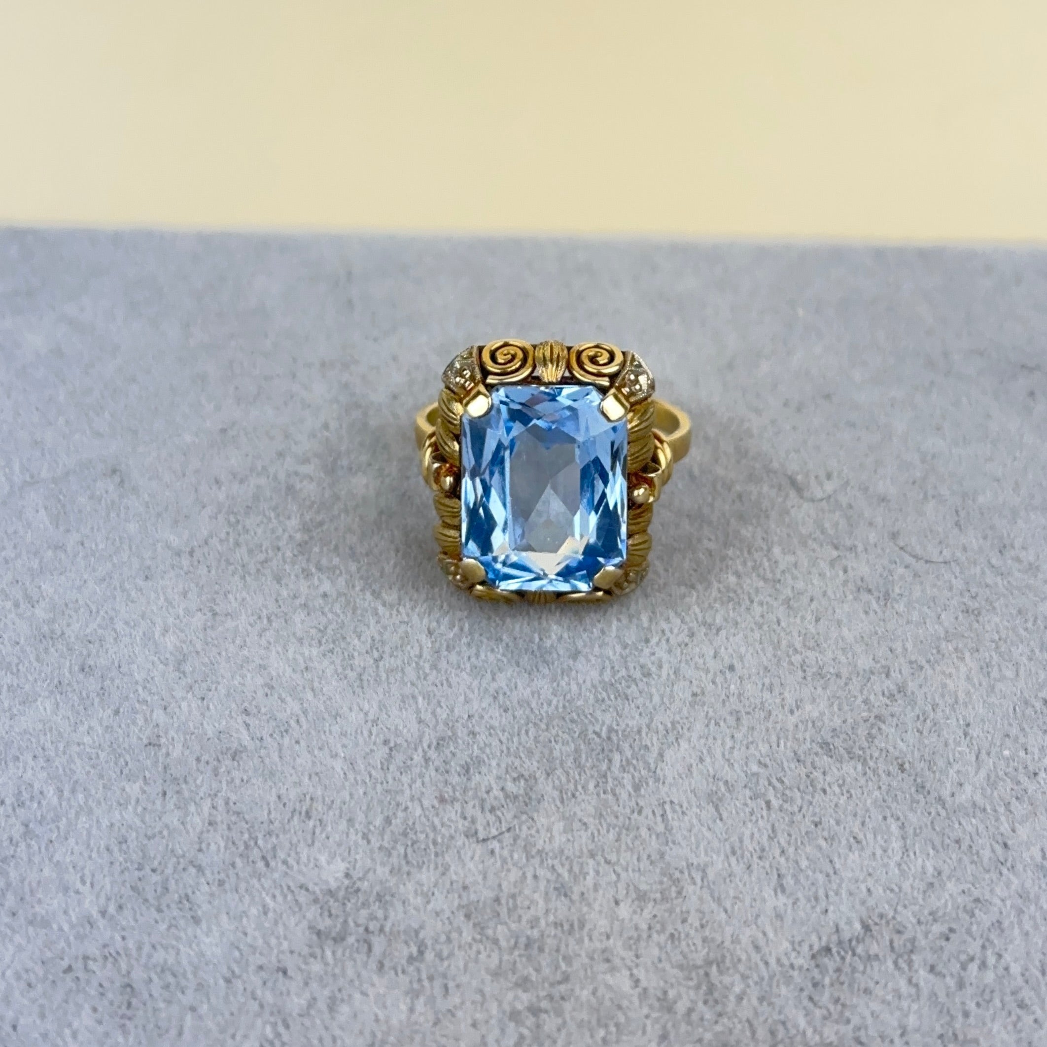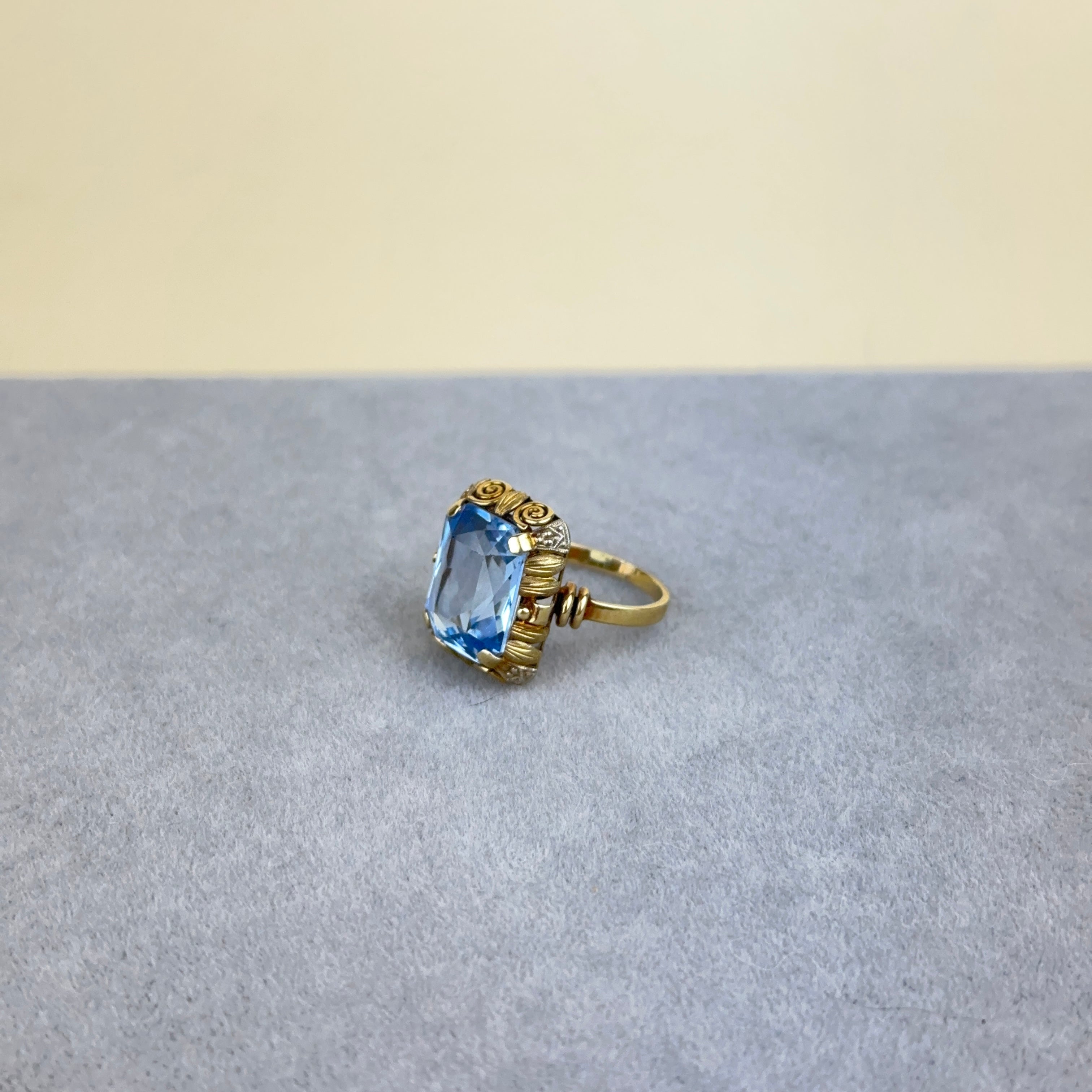 From the 1940s, this chunky and high quality lab created aquamarine is set in ornate retro modern 14k yellow and white gold metalwork with scroll details.