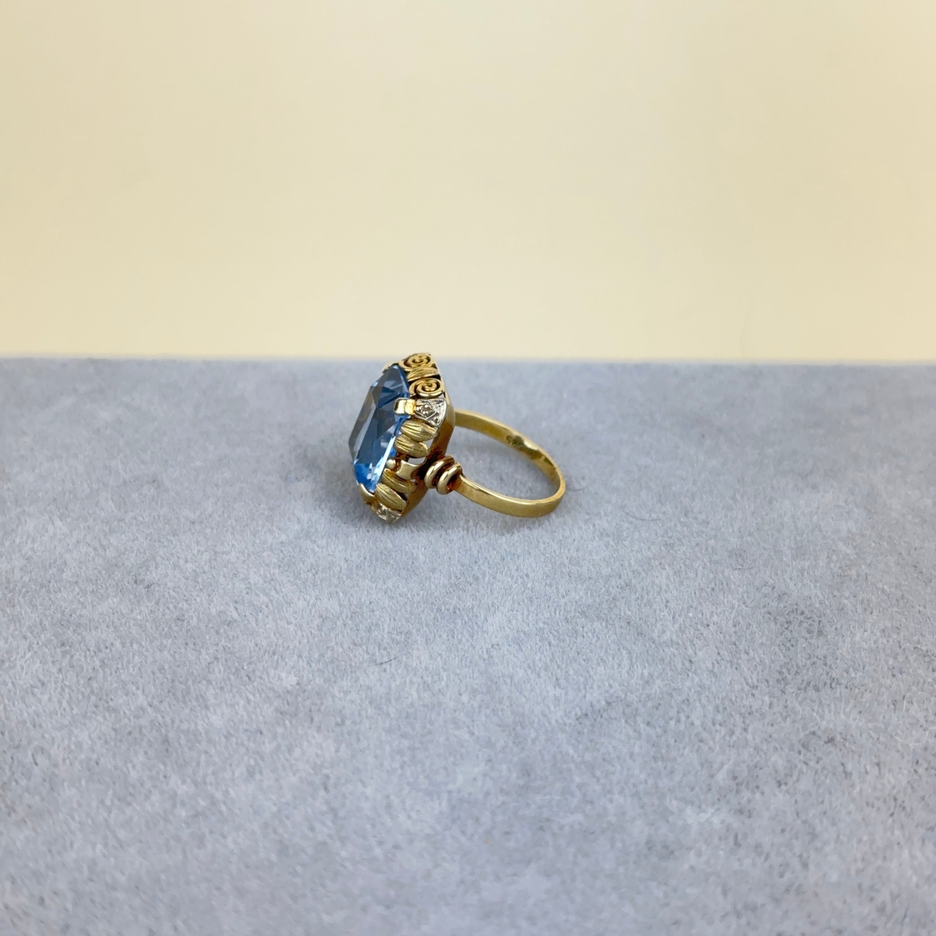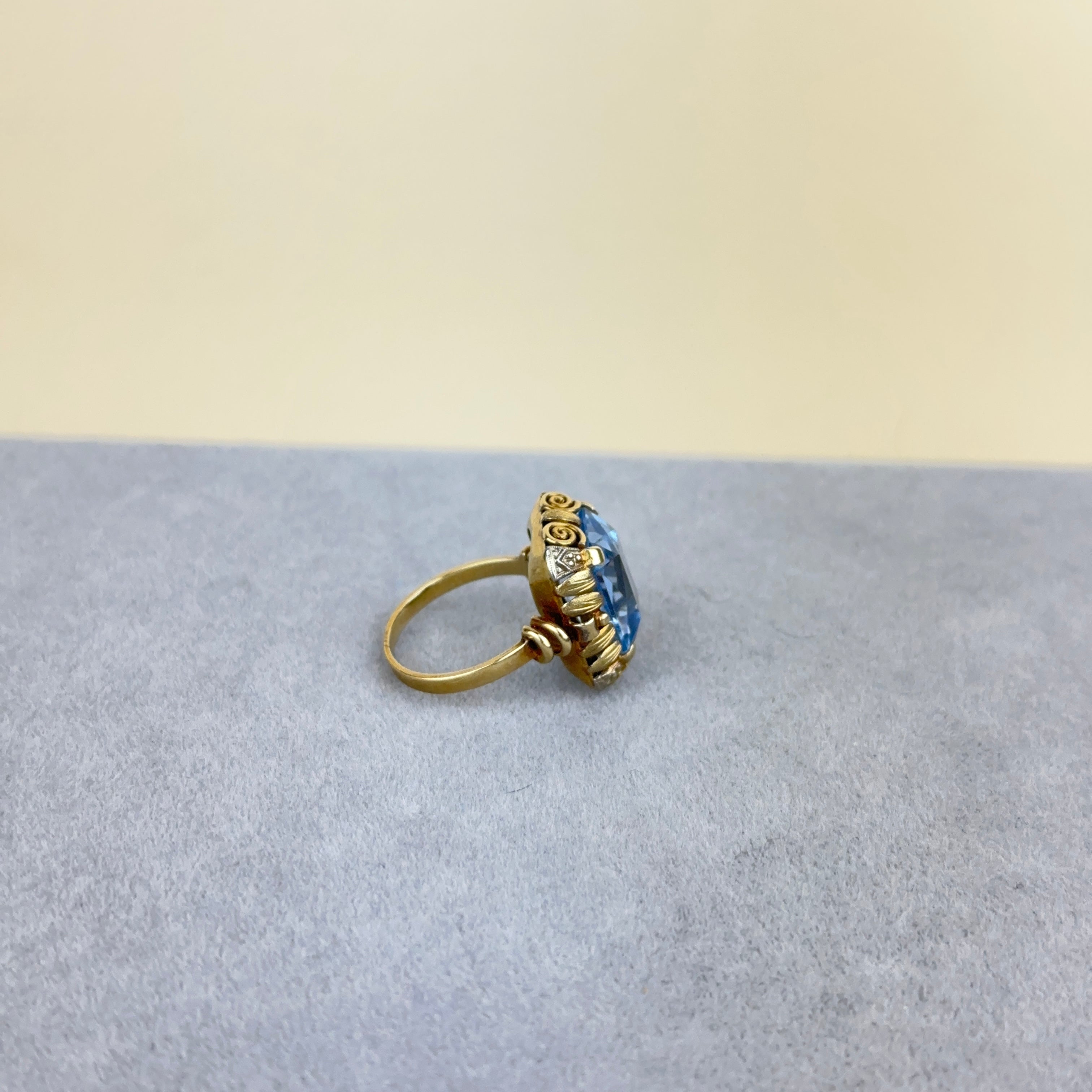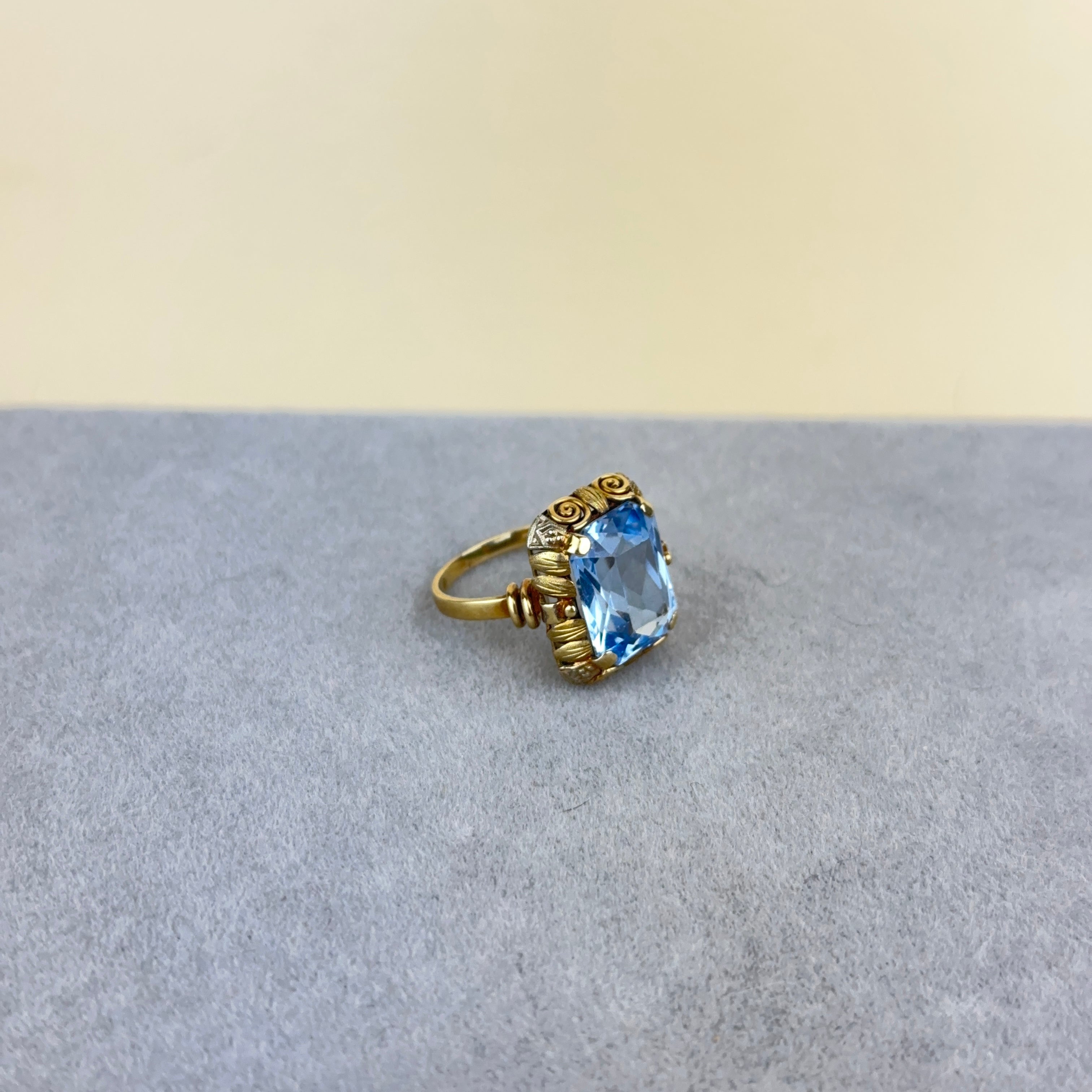 From the 1940s, this chunky and high quality lab created aquamarine is set in ornate retro modern 14k yellow and white gold metalwork with scroll details.