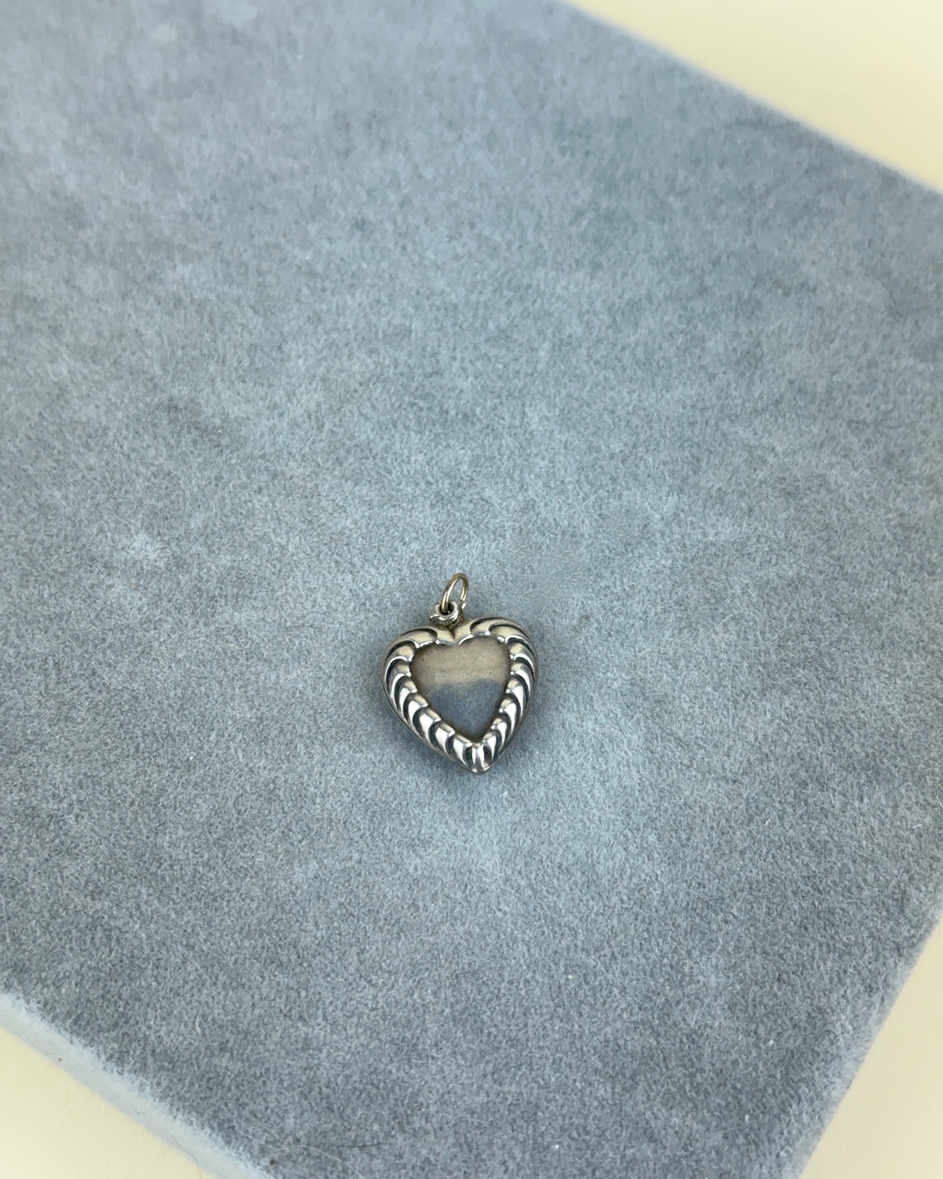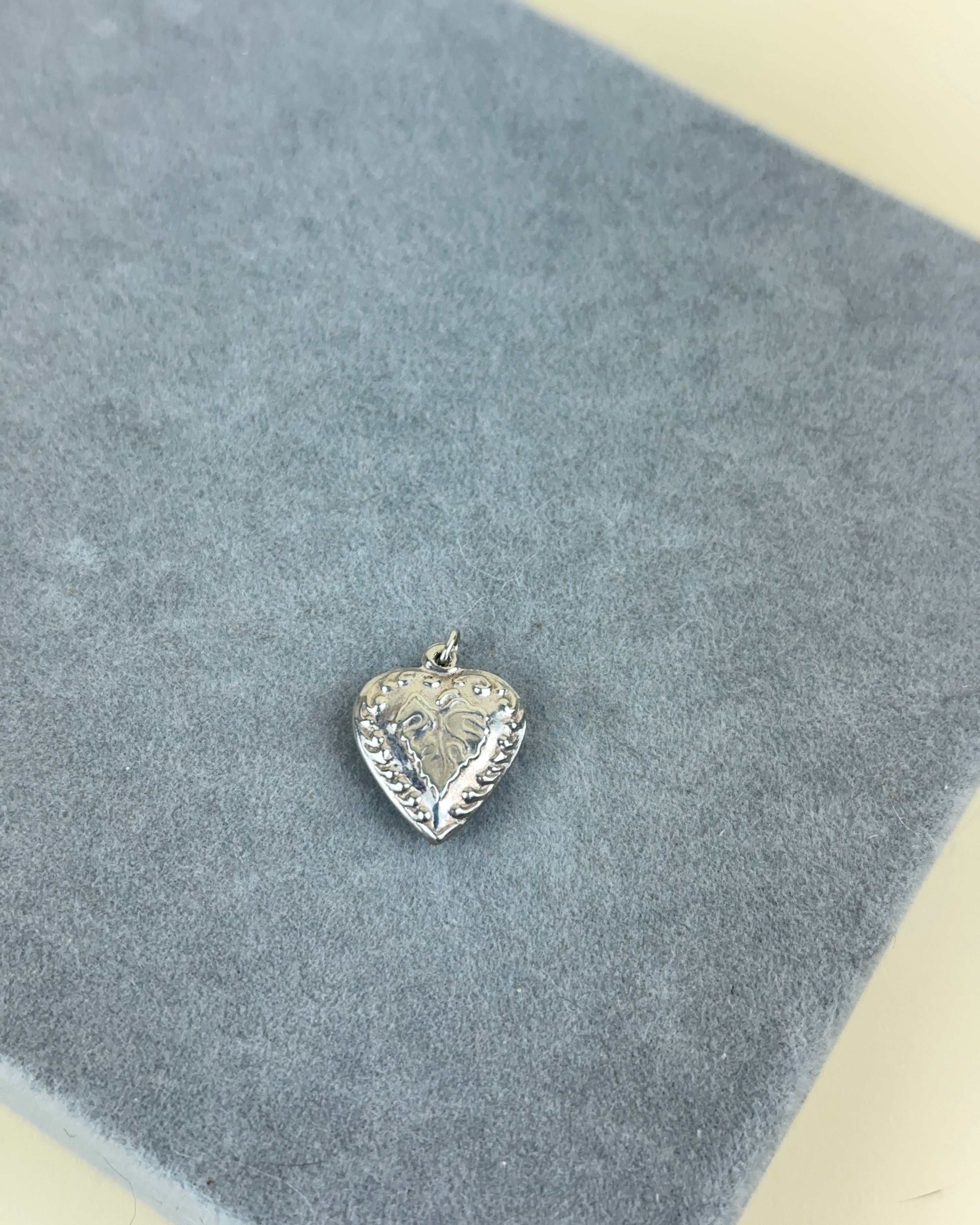 From the 1940s, these sterling silver puffy heart charms feature repousse designs. Sold as charms without chain or add on a sterling silver chain available in polished or antiqued finish. See options on drop down.