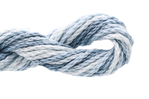 This is Watercolours from Caron Collection in color 303 Ticking. Rich variegated colors in stranded cotton. 2 strands on 13 mesh 1 strand on 18 mesh. 1 strand is about equivalent in size to #5 Perle Cotton.