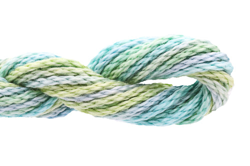 This is Watercolours from Caron Collection in color 311 Mint Julep. Rich variegated colors in stranded cotton. 2 strands on 13 mesh 1 strand on 18 mesh. 1 strand is about equivalent in size to #5 Perle Cotton.