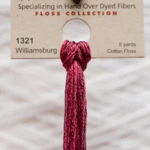 This is Overdyed Floss from Weeks Dye Works in color 1321 Williamsburg. Variegated threads in a wide range of shades, perfect for embroidery, needlepoint, and cross stitch. Use all 6 strands on 13 mesh, 3 or 4 strands on 18 mesh.