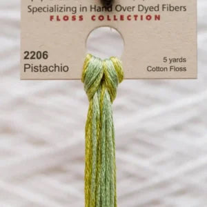 This is Overdyed Floss from Weeks Dye Works in color 2206 Pistachio. Variegated threads in a wide range of shades, perfect for embroidery, needlepoint, and cross stitch. Use all 6 strands on 13 mesh, 3 or 4 strands on 18 mesh.