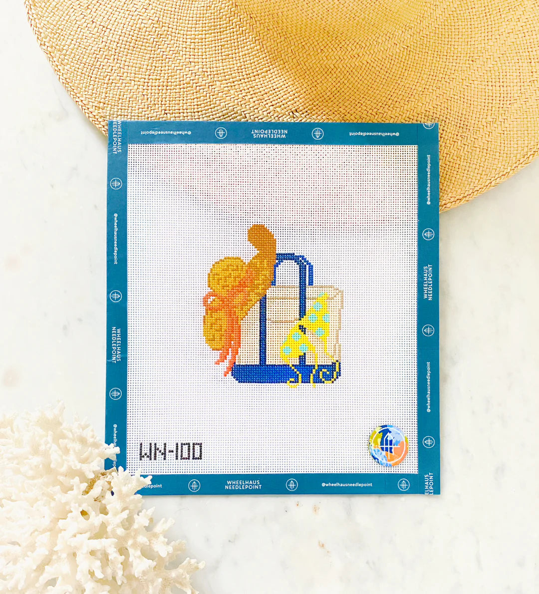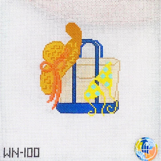 This hand painted needlepoint canvas by Wheelhaus Needlepoint features a classic boat tote filled with a straw hat and bikini.