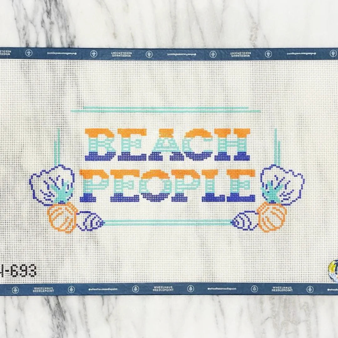This hand painted needlepoint canvas by Wheelhaus Needlepoint features a sign with "Beach People" and seashells.