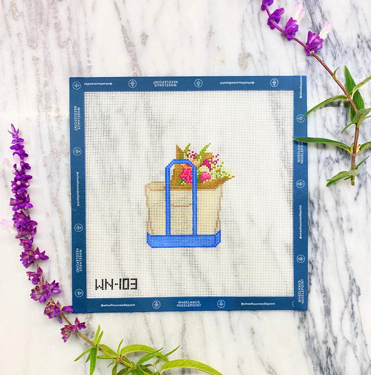 From Wheelhaus Needlepoint, this hand painted needlepoint canvas features a classic boat tote full of pretty flowers.
