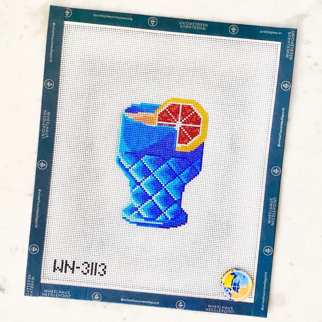 This hand painted needlepoint canvas by Wheelhaus Needlepoint features a margarita in a cobalt blue glass.