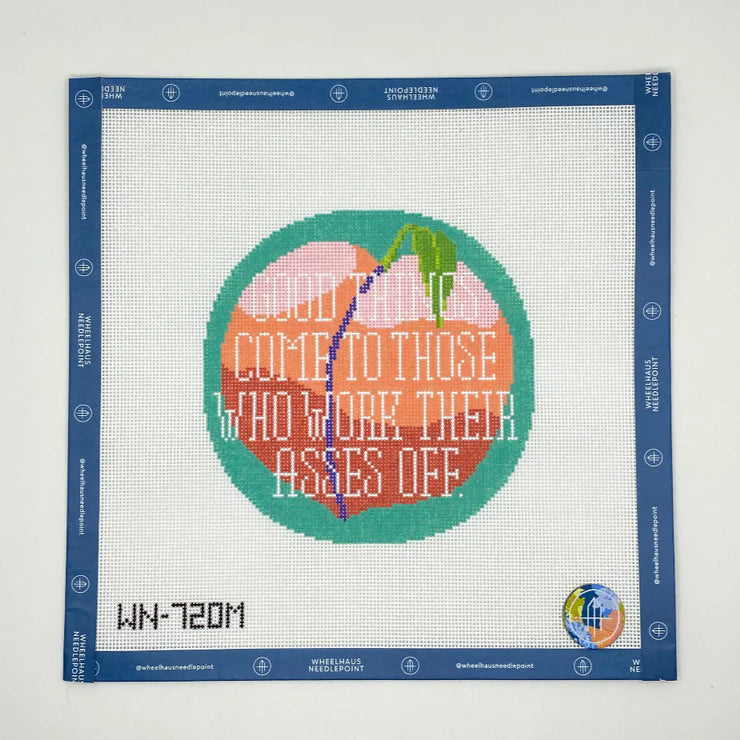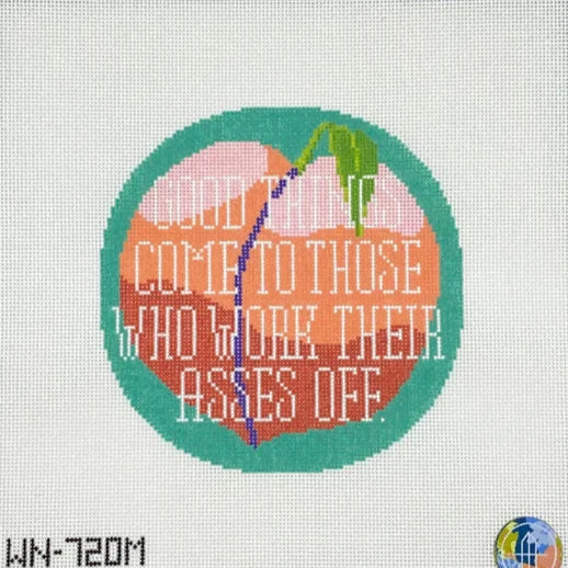 This hand painted needlepoint canvas by Wheelhaus Needlepoint features a juicy peach with "Good things come to those who work their asses off".