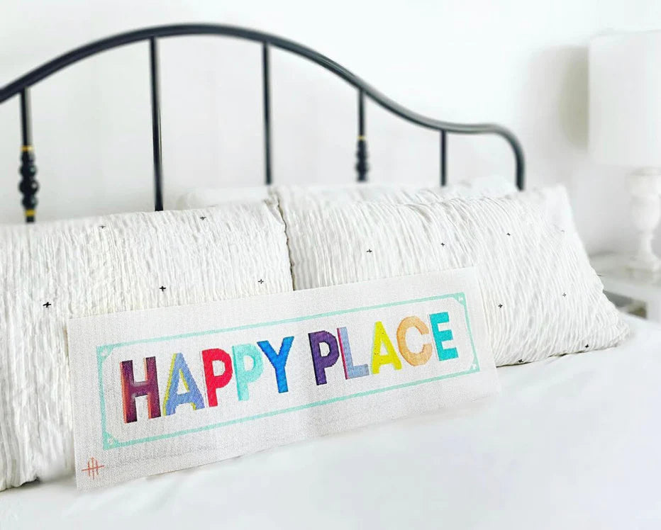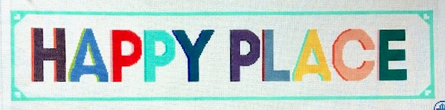 From Wheelhaus Needlepoint, this hand painted needlepoint canvas features the phrase "Happy Place". It's a long canvas which would be great to be finished into a bolster pillow.