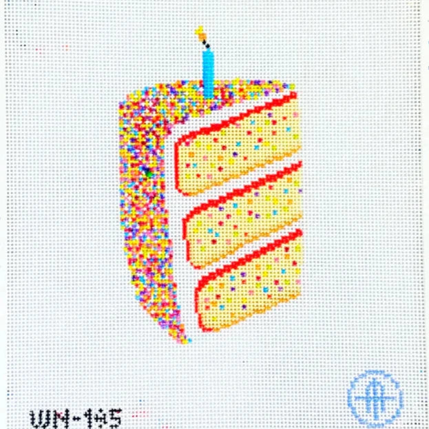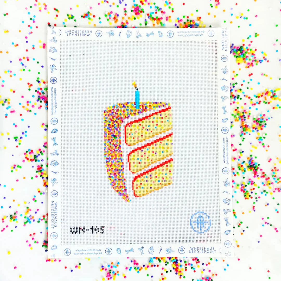 From Wheelhaus Needlepoint, this hand painted needlepoint canvas features a delicious slice of cake covered in sprinkles. Finished example shown for inspiration, materials and finishing services sold separately.