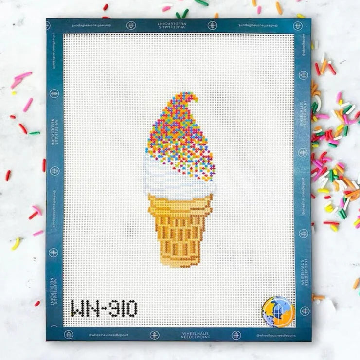 From Wheelhaus Needlepoint, this hand painted needlepoint canvas features a delicious soft serve ice cream cone covered with sprinkles.