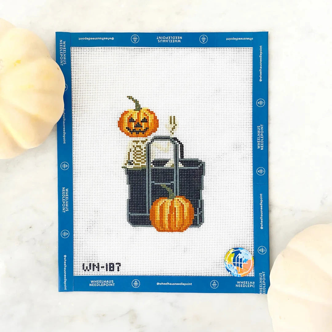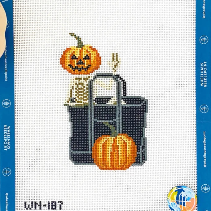 This hand painted needlepoint canvas by Wheelhaus Needlepoint features a classic boat tote filled with a spooky jack o'lantern.