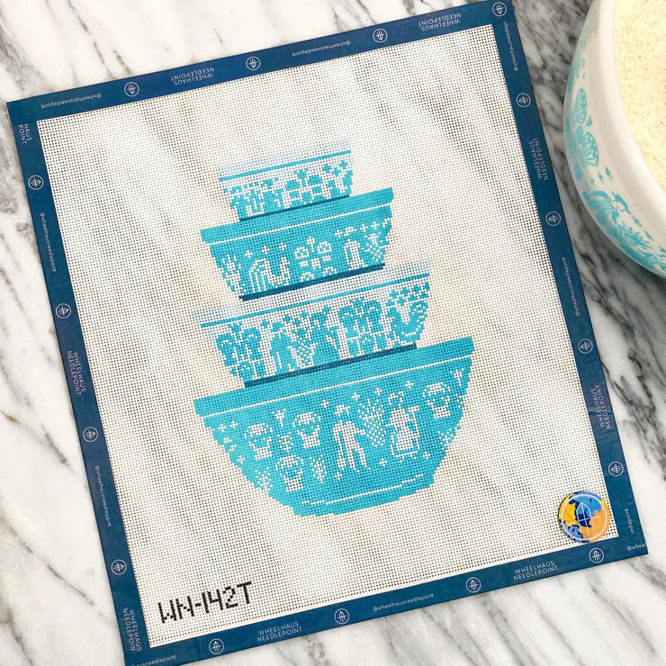 From Wheelhaus Needlepoint, this hand painted needlepoint canvas features beloved vintage bowls in blue and white.