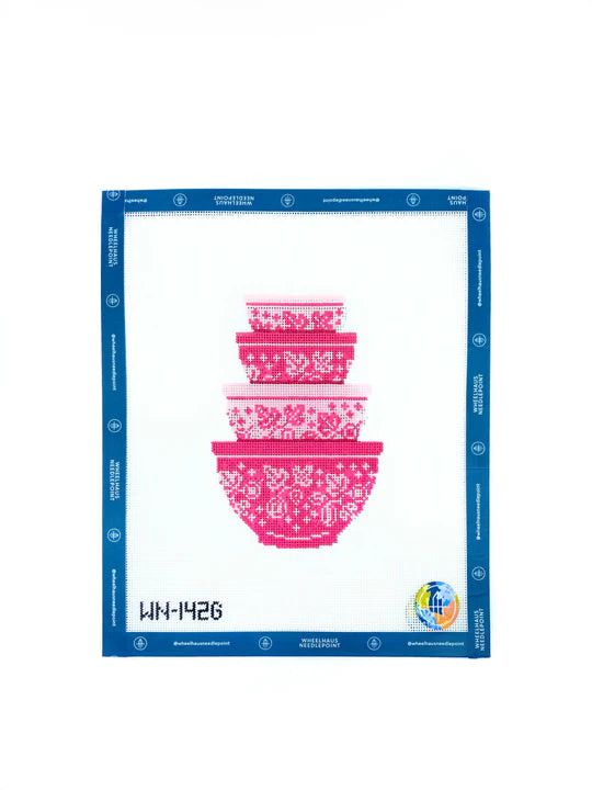 From Wheelhaus Needlepoint, this hand painted needlepoint canvas features beloved vintage bowls in pink and white in a mini ornament size.