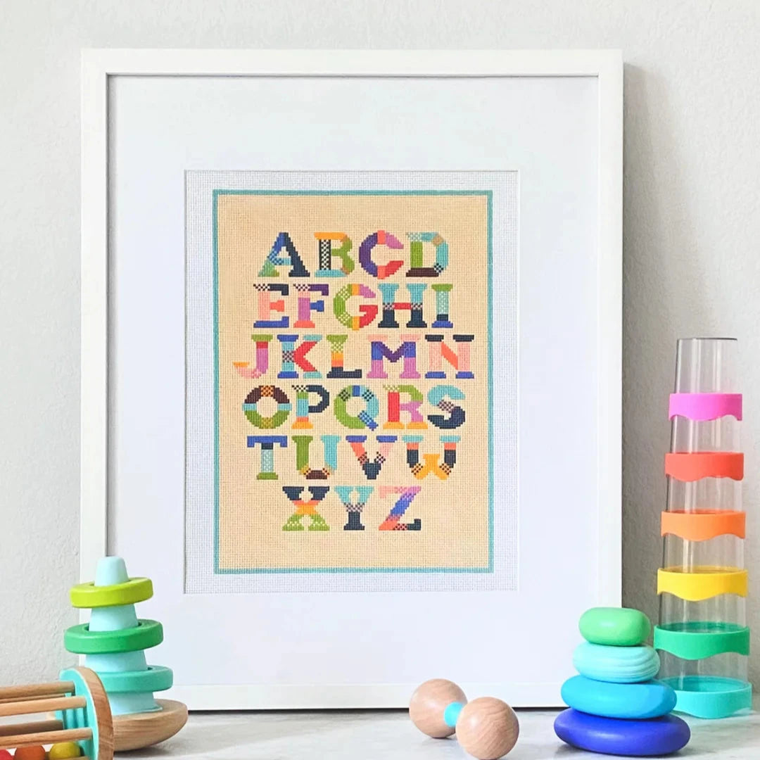 This hand painted needlepoint canvas by Wheelhaus Needlepoint features an alphabet with colorful letters.
