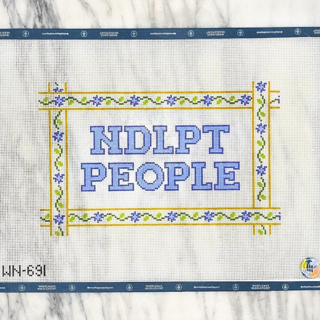 This hand painted needlepoint canvas by Wheelhaus Needlepoint features "Ndlpt People" in colorful letters.