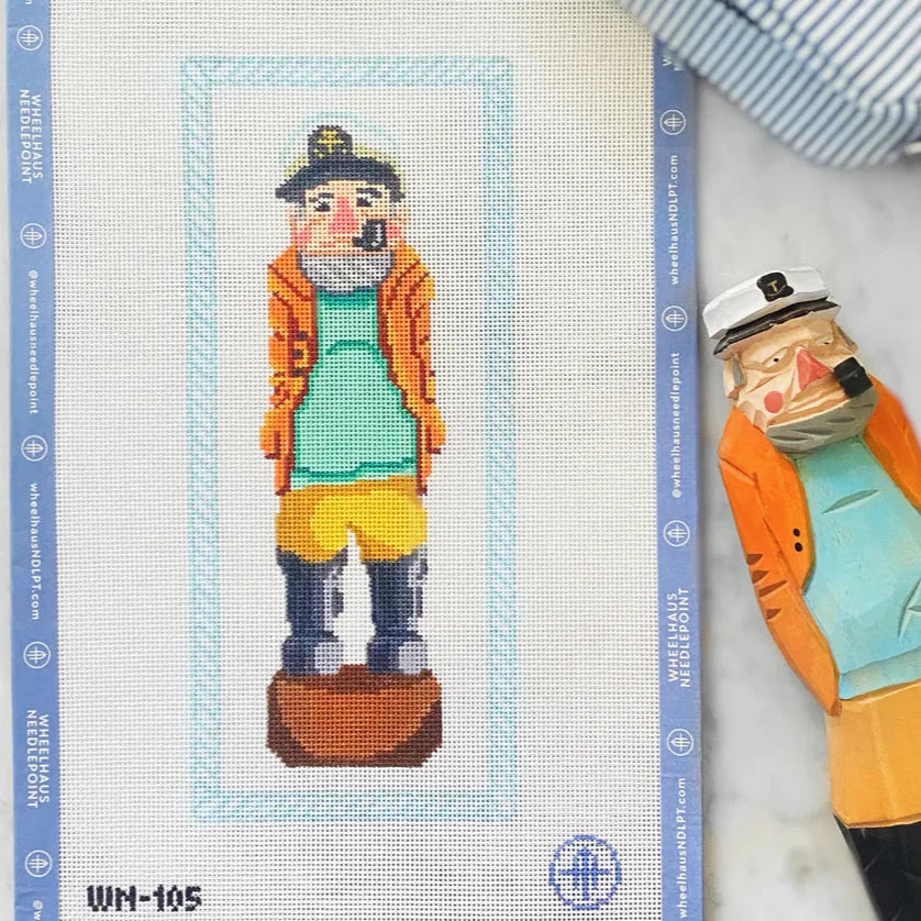 This hand painted needlepoint canvas by Wheelhaus Needlepoint features a vintage inspired carved wood sea captain.