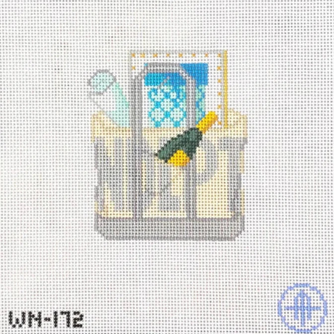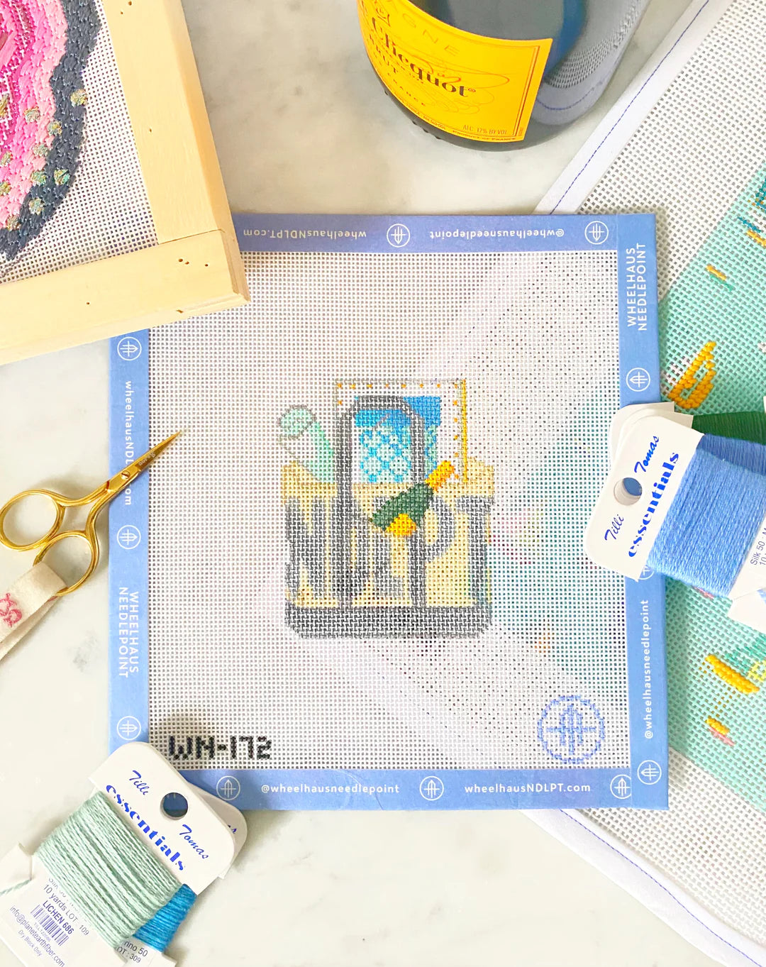 From Wheelhaus Needlepoint, this hand painted needlepoint canvas features a classic boat tote filled with stitching and wine.