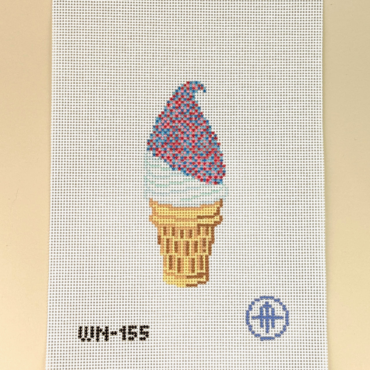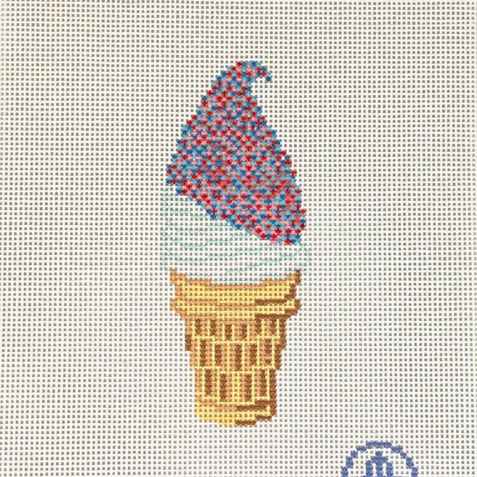This hand painted needlepoint canvas by Wheelhaus Needlepoint features a soft serve ice cream cone with patriotic colored sprinkles.