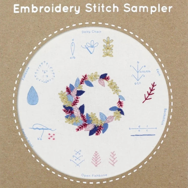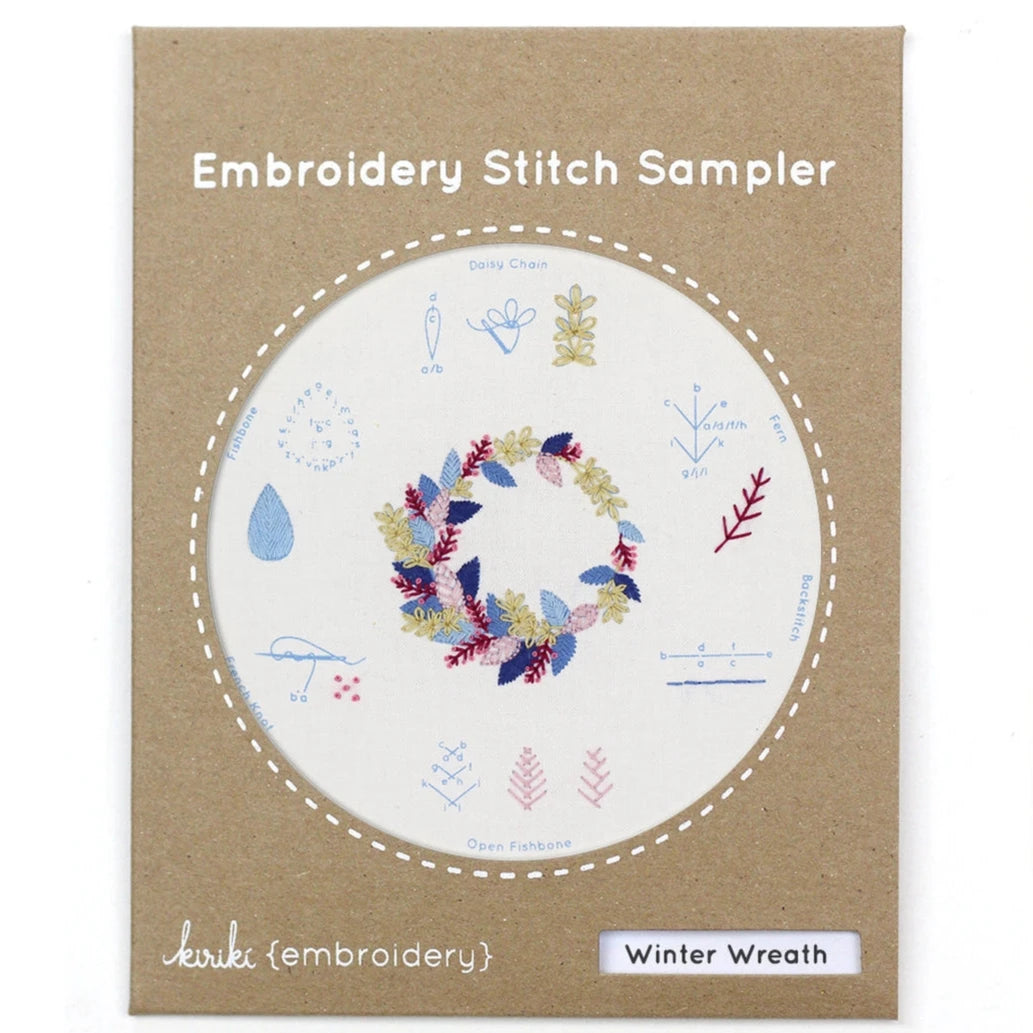 From Canadian brand, Kiriki Press, comes this pretty Winter Wreath stitch sampler. It's a great introduction to stitches used in Kiriki Press and other embroidery patterns. Each stitch is printed right onto the fabric with an easy-to-follow lettered guide, plus you get to practice the stitch several more times on the sampler, including a finished piece in the center.