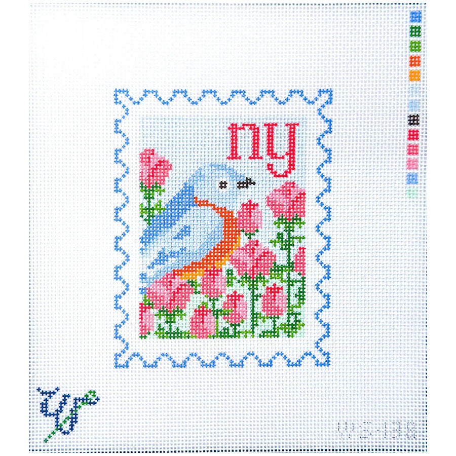 This is a hand painted needlepoint canvas by Wipstitch. It features a stamp with the New York state bird and flower.